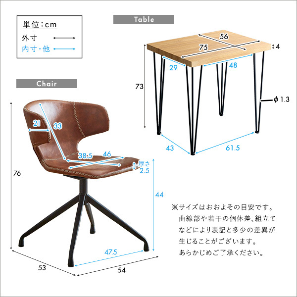 ヴィンテージレザー調ダイニングチェア2脚 75cm幅テーブル 3点セット ARMOS×Umbure WA/キャメル