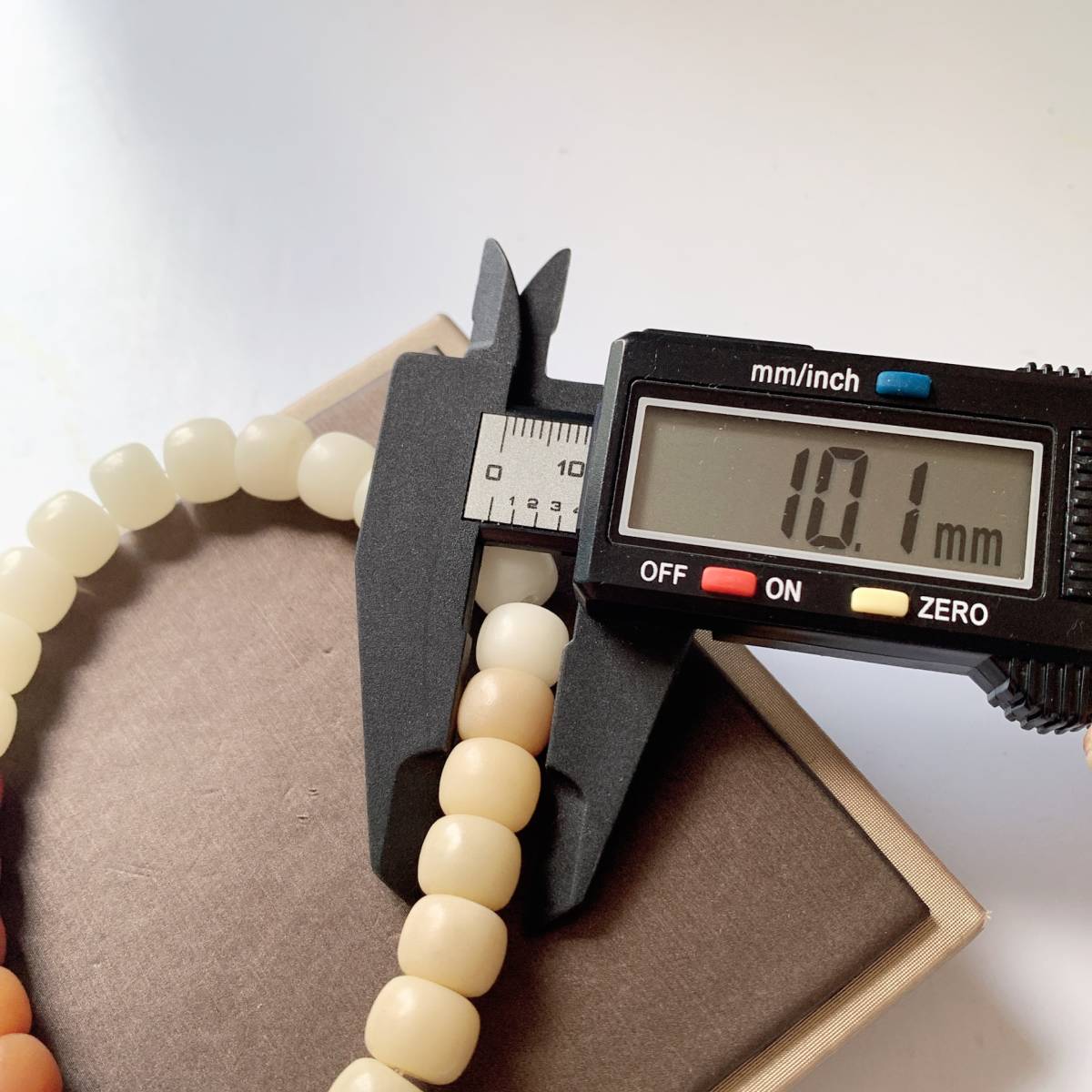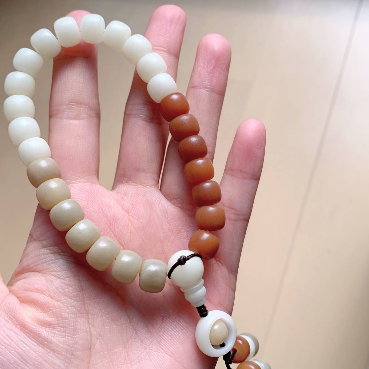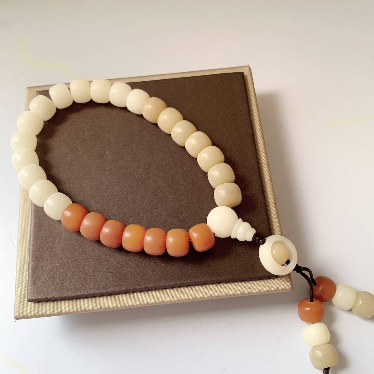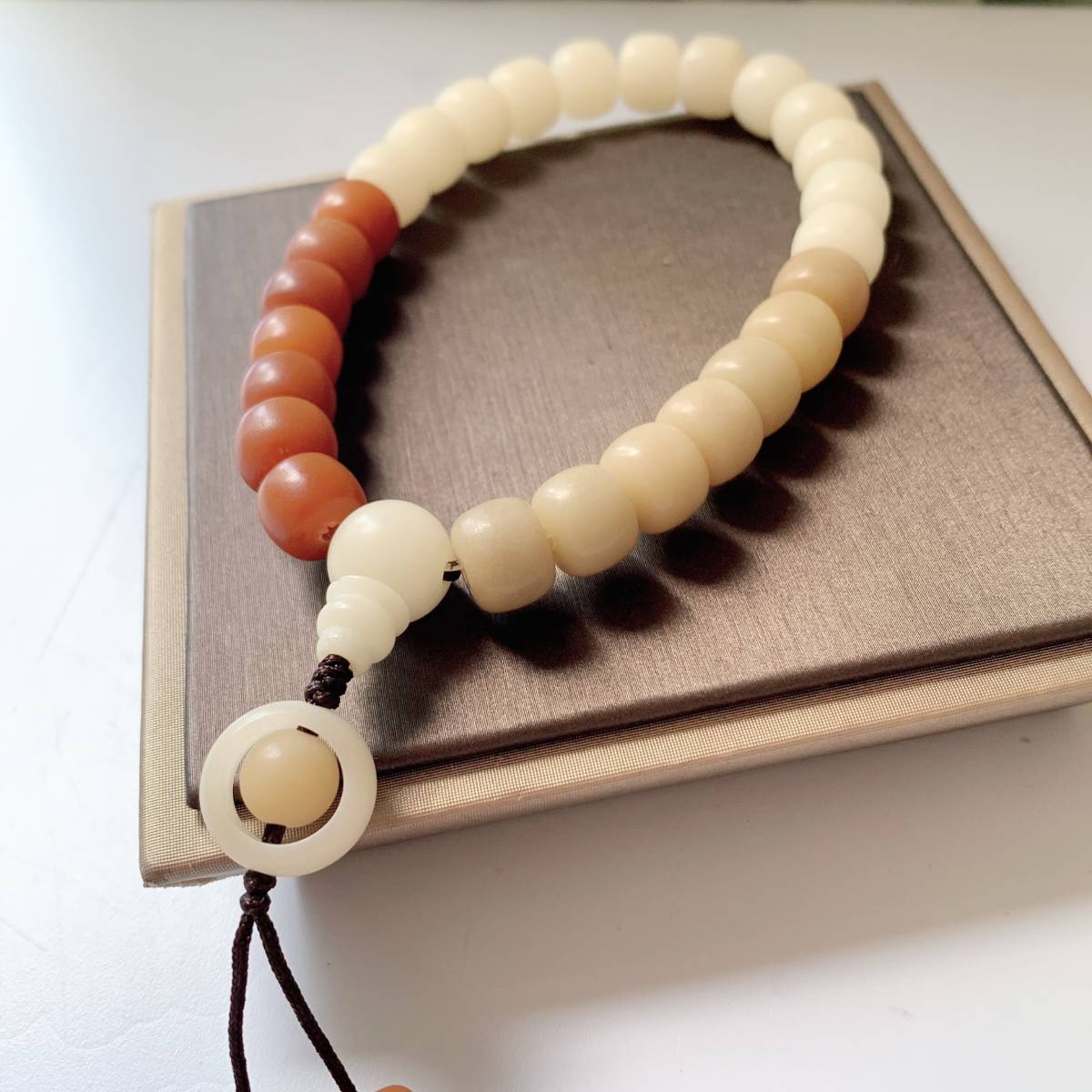 白い玉は、聖なるパワーが備わり、マイナスエネルギーを浄化する艶のある象牙質の実、「菩提根」。 菩提根は約700年前にインドとミャンマーより中国に来た物です。 貝多羅樹(ばいたらじゅ)の実の皮を剥ぐと、艶のある象牙質の実が出てくるのですが、使っているうちに茶色い飴色に変化し、その様が菩提樹の木の根を連想させることから「菩提根」と名付けられました。 木の寿命は60~70年と言われていますが、「菩提根」は、その命の終わる一番最後にただ一度だけ実をつけます。
