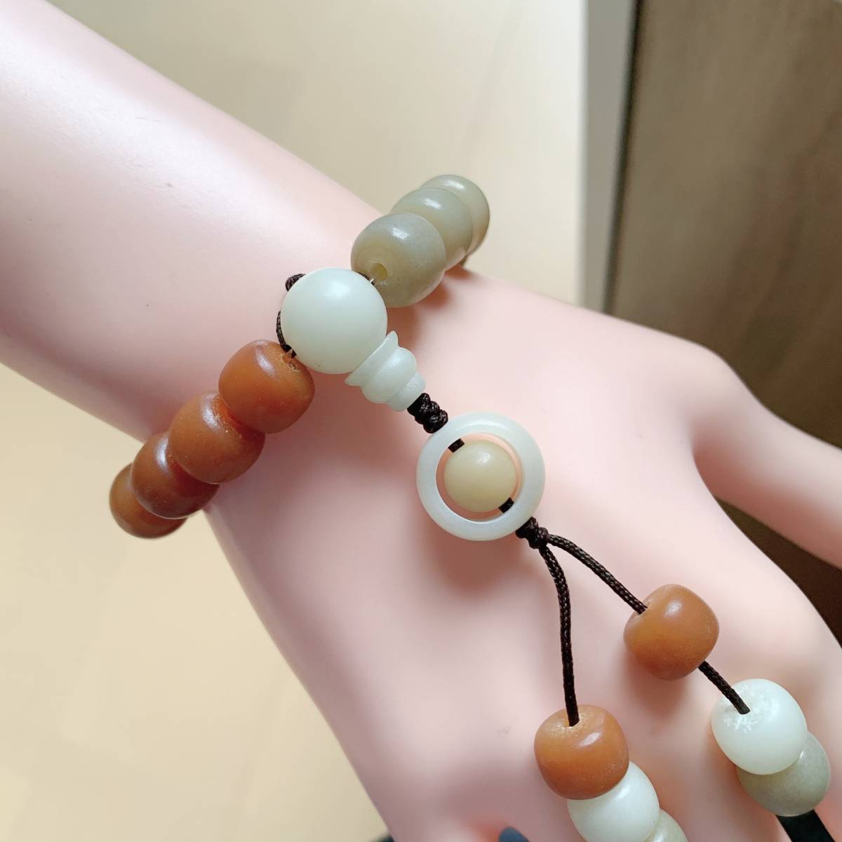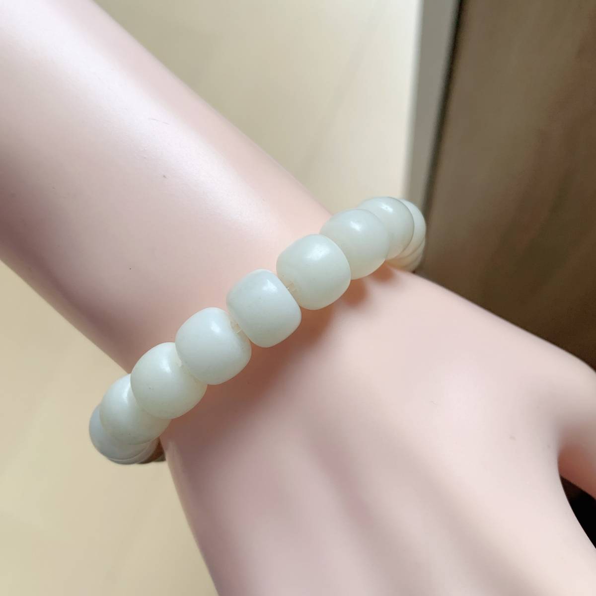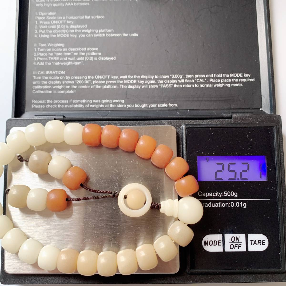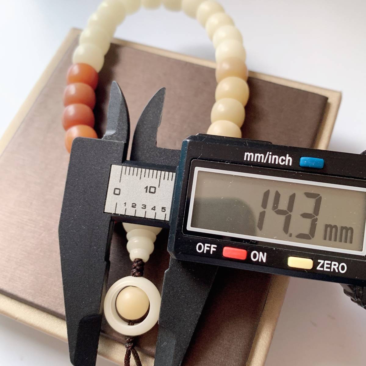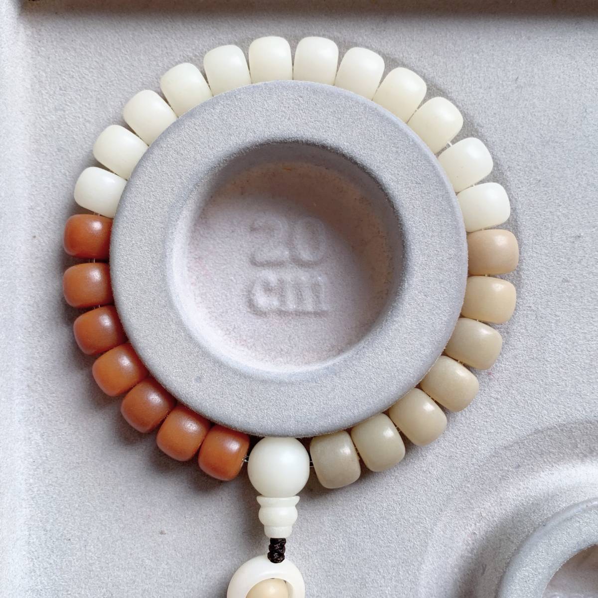 白い玉は、聖なるパワーが備わり、マイナスエネルギーを浄化する艶のある象牙質の実、「菩提根」。 菩提根は約700年前にインドとミャンマーより中国に来た物です。 貝多羅樹(ばいたらじゅ)の実の皮を剥ぐと、艶のある象牙質の実が出てくるのですが、使っているうちに茶色い飴色に変化し、その様が菩提樹の木の根を連想させることから「菩提根」と名付けられました。 木の寿命は60~70年と言われていますが、「菩提根」は、その命の終わる一番最後にただ一度だけ実をつけます。