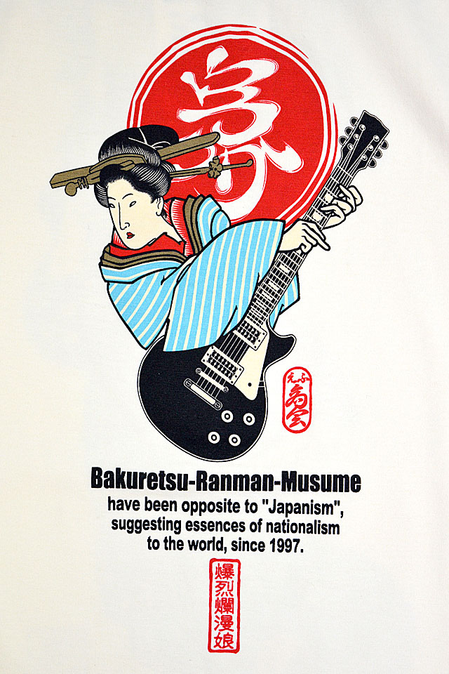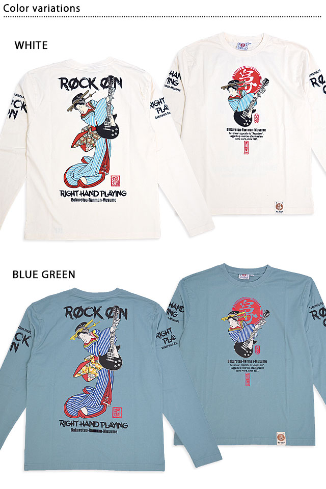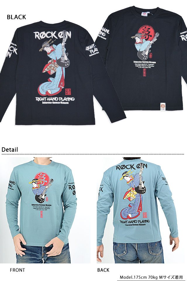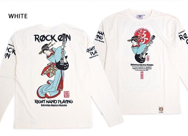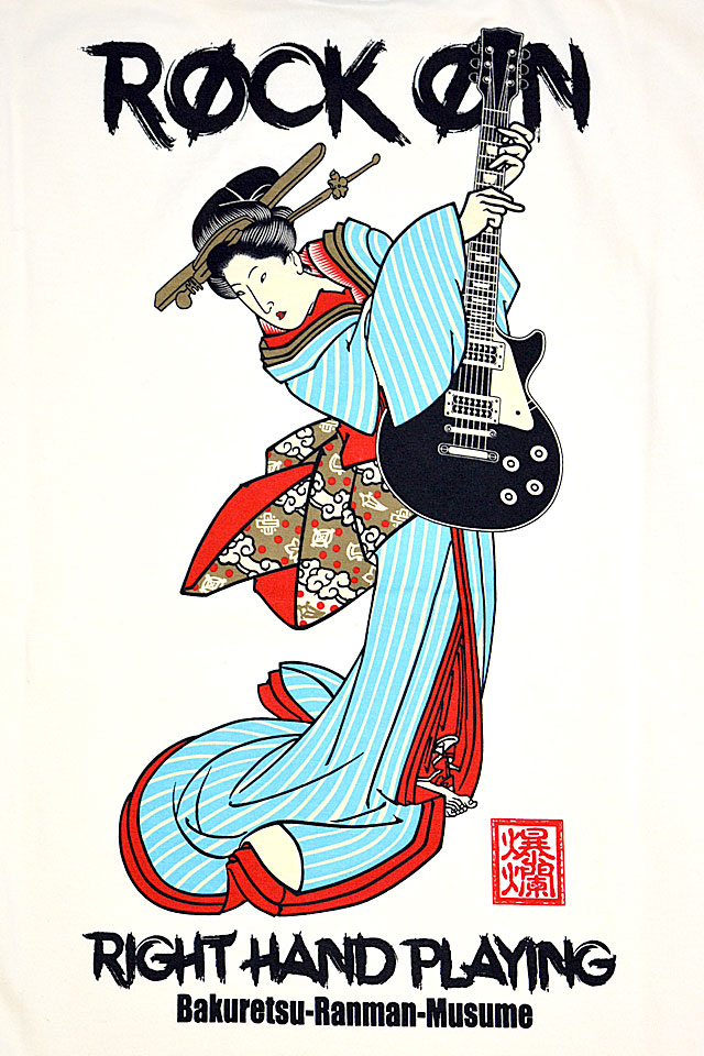 爆烈爛漫娘さんから「ROCK ONロングTシャツ(RMLT-329)」のご紹介です。 花魁がライトハンド奏法でギターを演奏するデザインです。 「ROCK ON」はロック音楽が好きな「ROCKERS」の間で使われているフレーズで、思う存分楽しむ!という意味です。 ライトハンド奏法とは、右手の指で弦をタップして音を出すギターのテクニックで「タッピング」とも呼ばれます。 ボディーには、爆烈爛漫娘お馴染のよれにくくタフな生地を採用しました。 | |||||||||||||||||||||||||