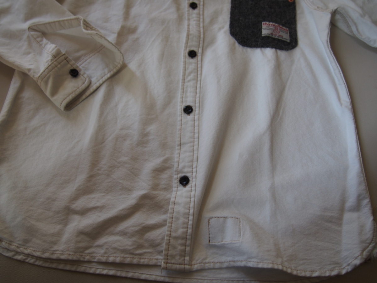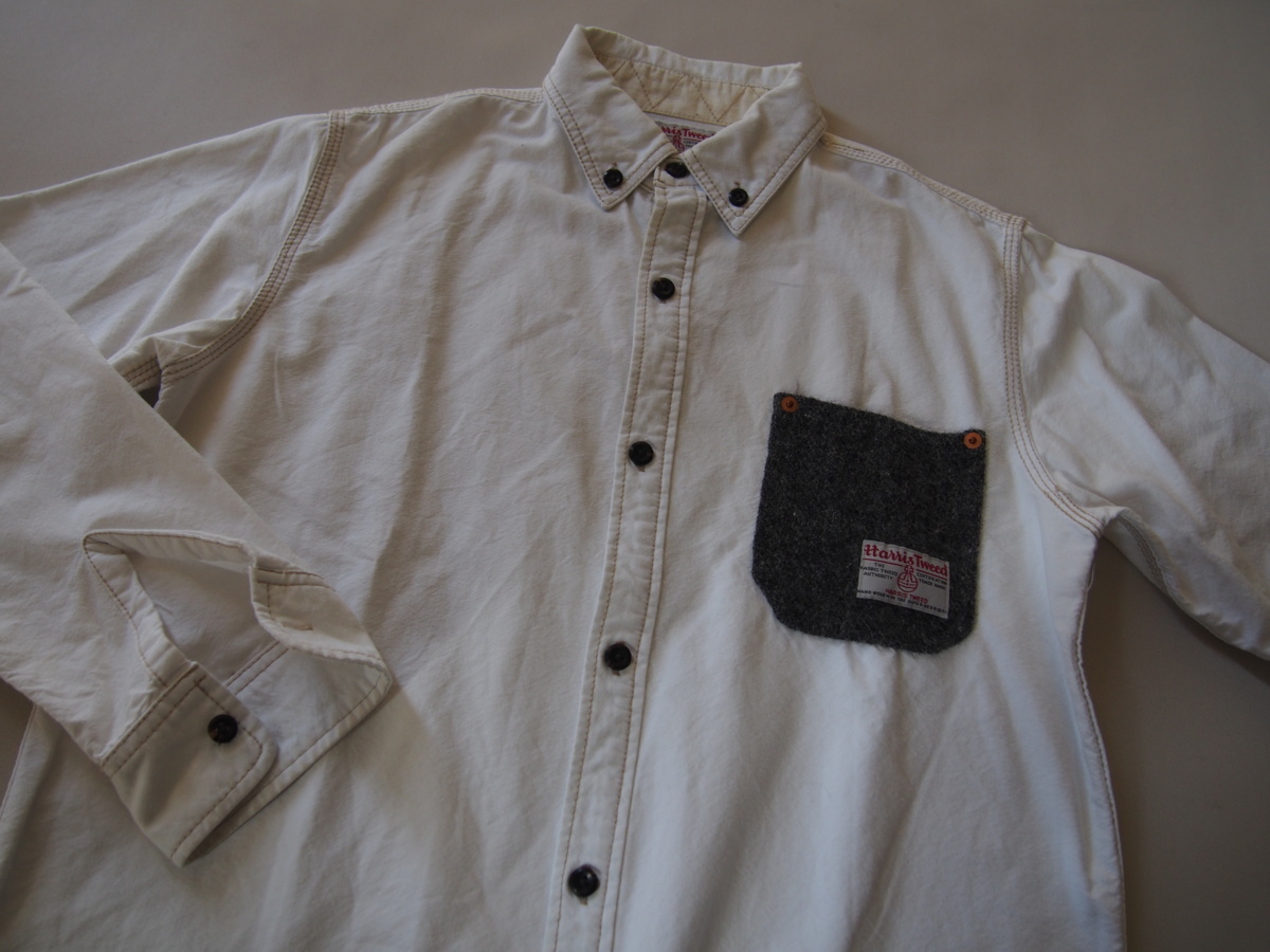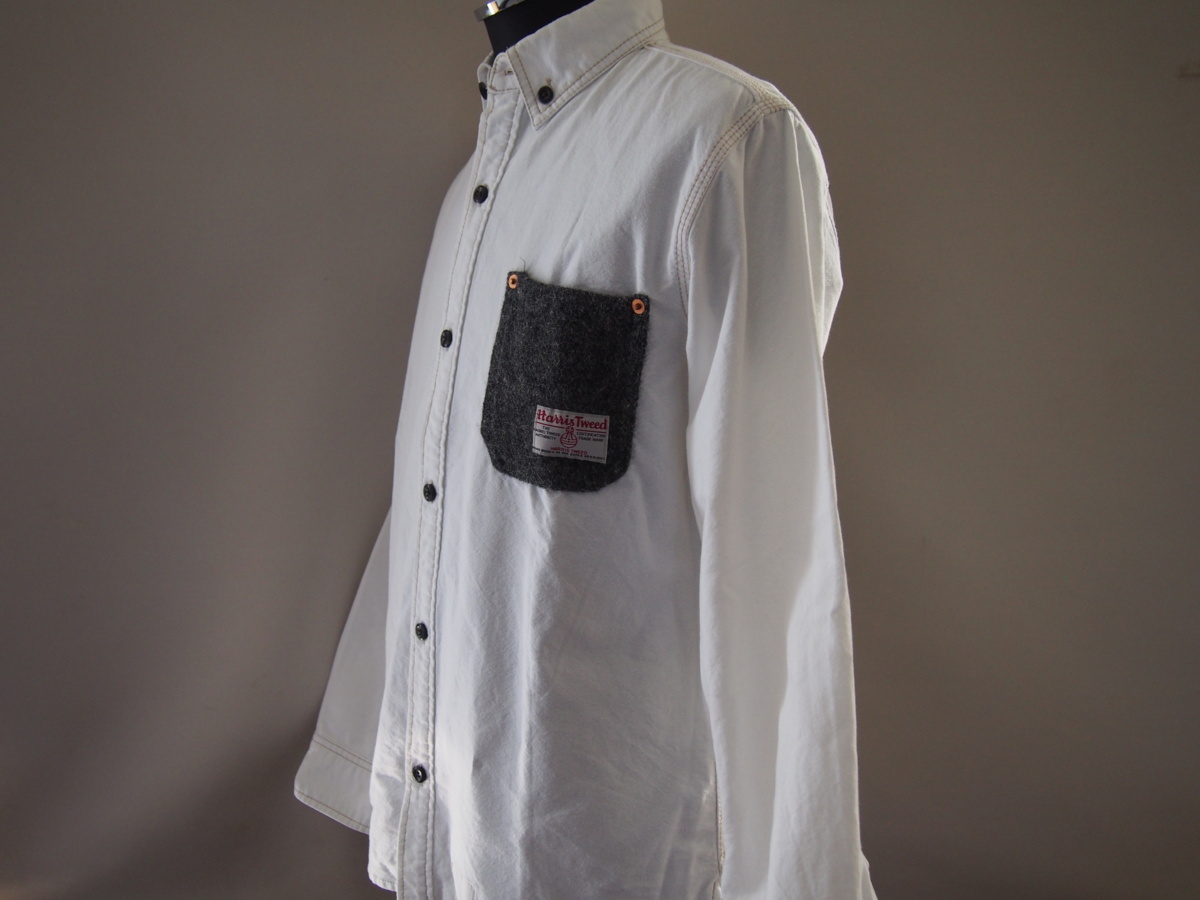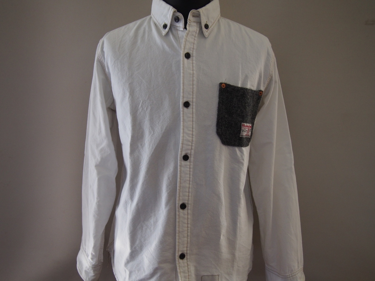 ハリスツイード★長袖シャツ★部分シミ有★ハリスツイード地ポケット切替★ボタンダウン★部分ステッチ×フリンジ加工★Lサイズ★Harris Tweed | |||||||||||||||||||