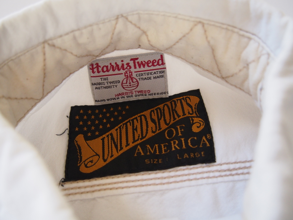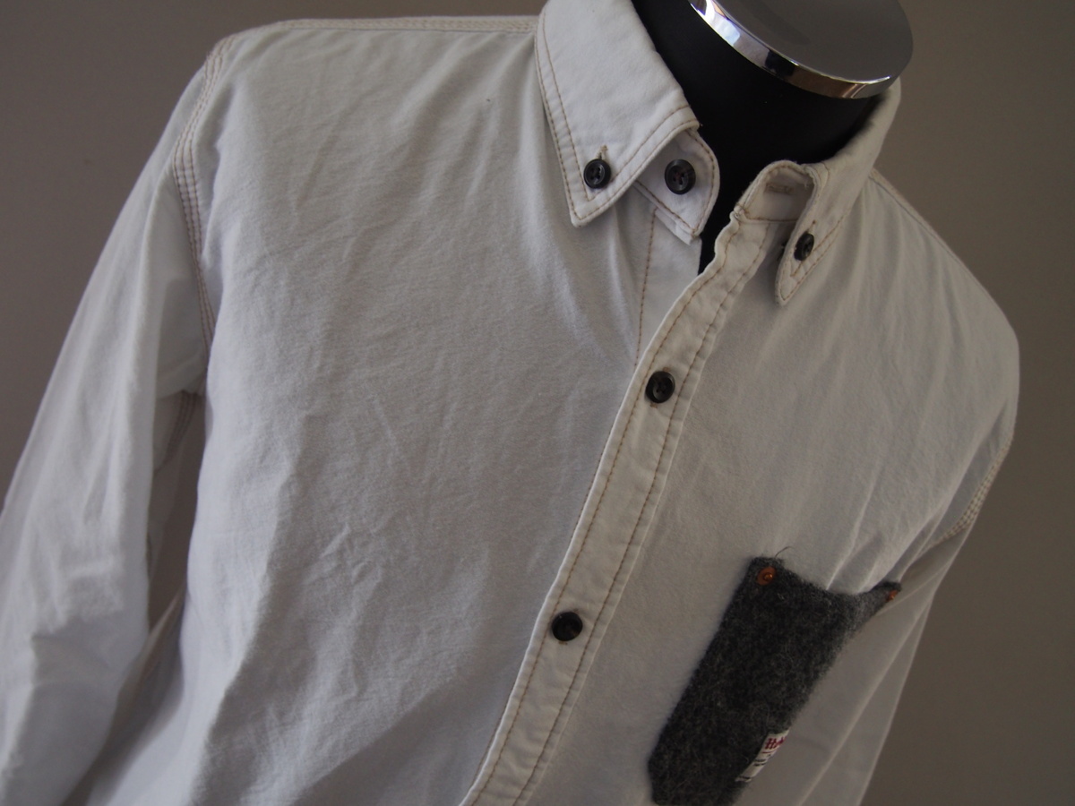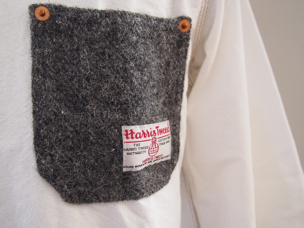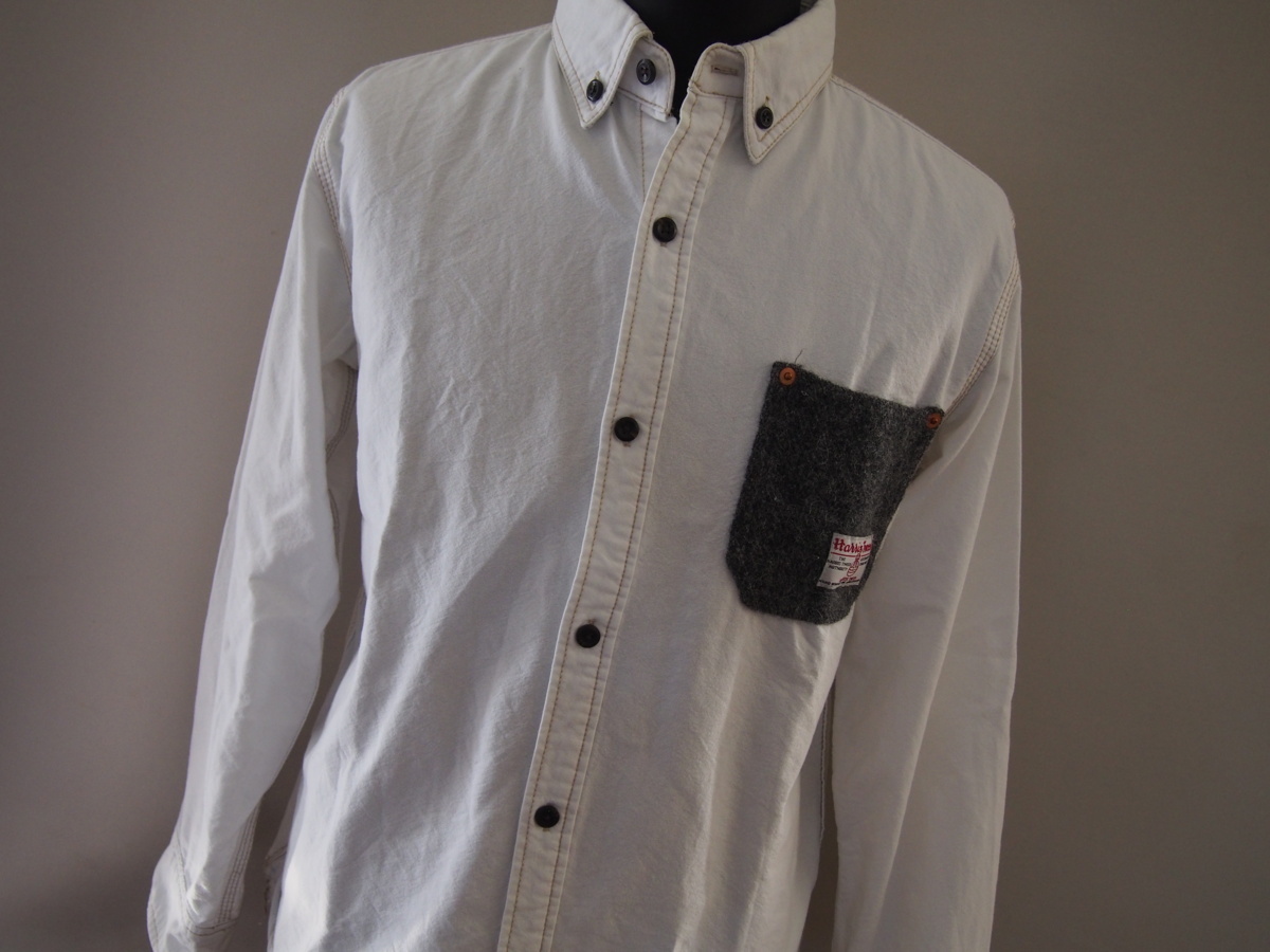 ハリスツイード★長袖シャツ★部分シミ有★ハリスツイード地ポケット切替★ボタンダウン★部分ステッチ×フリンジ加工★Lサイズ★Harris Tweed | |||||||||||||||||||