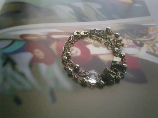 センチメンタル・ガール・・シリーズです♪リゼッタの宝石箱・・シックなゴールデンパイライトのブレスレット2点セットです♪ブロンズ色のメタリックな輝きが甘すぎない大人のロマンチックしています♪♪重ねて着けても単品で使われても素敵です♪♪4ミリから5ミリ位のパイライトのタンブルカットにはクラシカルなデザインチェーンを合わせてアンティークモダンな表情です♪長さは16センチ+アジャスター6センチで最長22センチ位です♪♪9ミリから11ミリ位のパイライトのタンブルカットにはスワロの12ミリのヘキサゴンを合わせました♪パンクっぽい個性的なデザインです♪長さは全長22センチ位で調節自由です♪それぞれ単品でも出品しています♪お揃いのネックレスも出品しています♪シンプルで飽きのこないいつまでも着けられるデザインを考えて作りました!ハンドメイドをご理解頂いてノークレーム、ノーリターンでお願いします