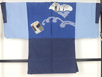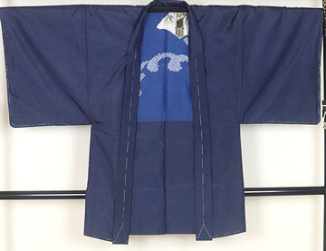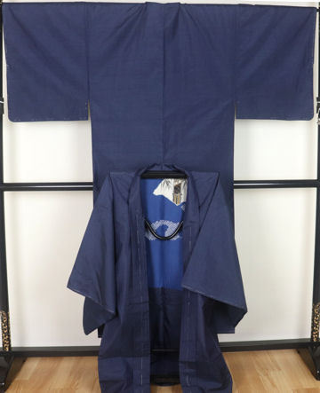 | 染大島紬アンサンブル 袷 紺地 羽織裏柄 絞り扇 東海道五十三次画 M寸 新品 仕付け付き | |