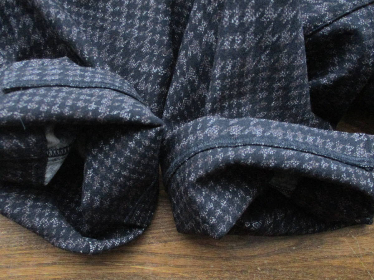 写真のように、前オーナーが、総丈につき、お直し専門店に依頼して、5㎝程度の裾上げ加工を施しているとのことであり、総丈及び股下が通常より、短めのフォルムとのこと“