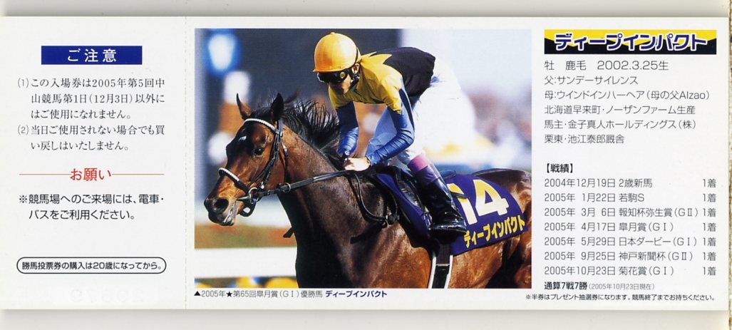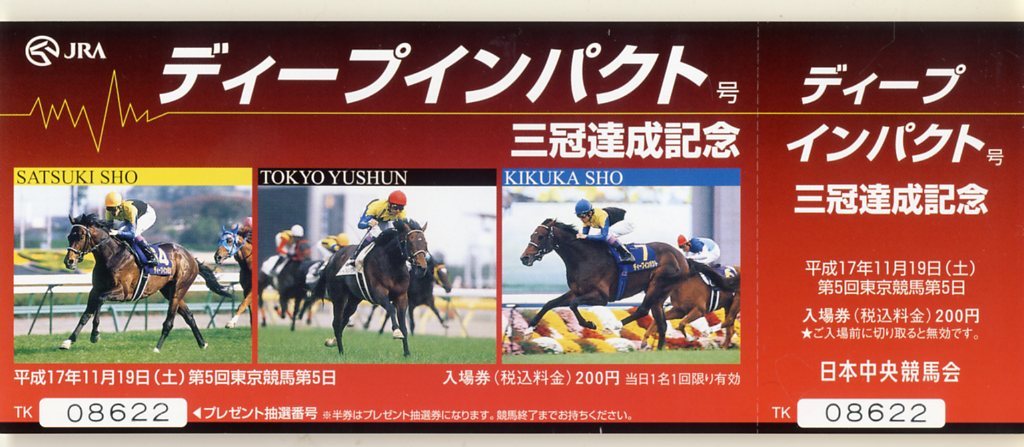 | ★ディープインパクト JRA 三冠達成記念 入場券 東京競馬場 京都競馬場 中山競馬場 3種類セット +第66回菊花賞 三冠馬 武豊 2005年 競馬 極美品 即決 | |