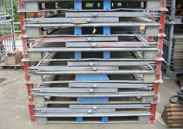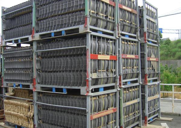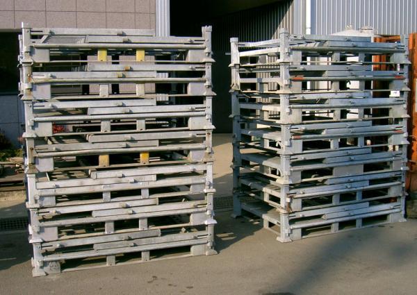 元々は瓦を入れていたパレットです。当方ではご覧のように瓦ではなく色々な資材を入れて使用しています。段積みですが4段くらいまでOKです。パレットの自重は約95kgです。サイズは約105cm×約158cm、高さ約113cmです。瓦を入れた場合、1パレット約1.5tになります。この場合でも3段程度はOKです。 出品は1個の価格です。