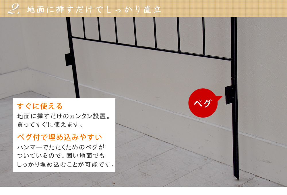 ・基本的に埋め込み部分をしっかり埋め込んで頂ければ自立しますが、柔らかすぎる地面などでは倒れる恐れがありますので、お客様自身で固定いただくか、ご使用をお避けください。