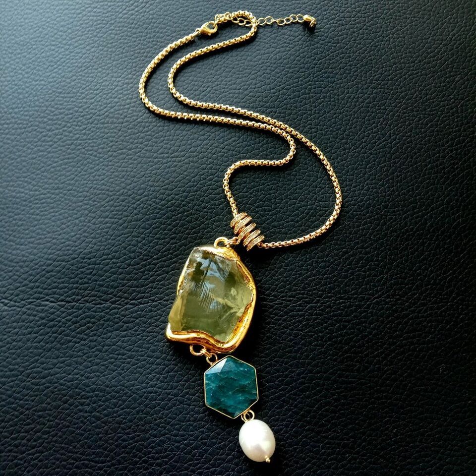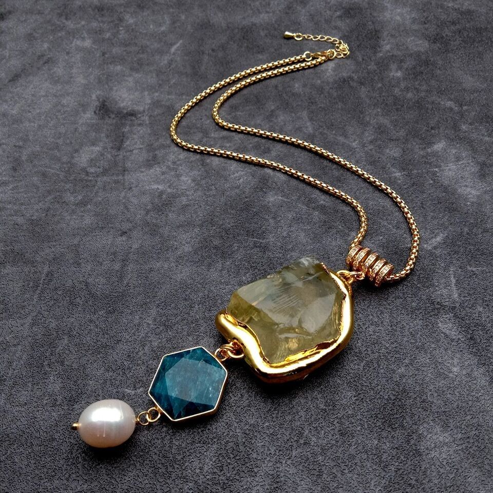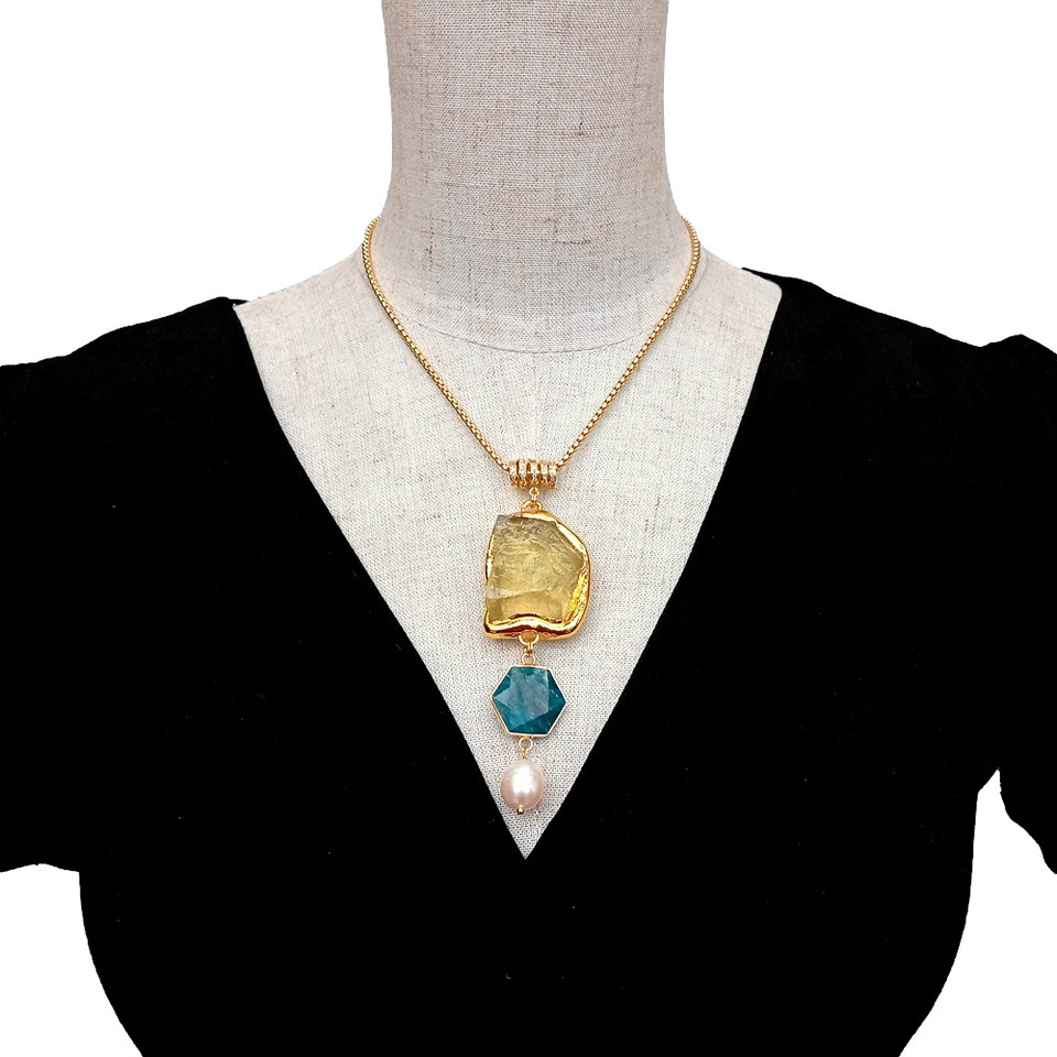 素材: 淡水養殖パール(12x14mm)、天然 レモンクォーツ(27x35mm)、天然 ブルーアパタイト(19mm)、ゴールドプレーティッド