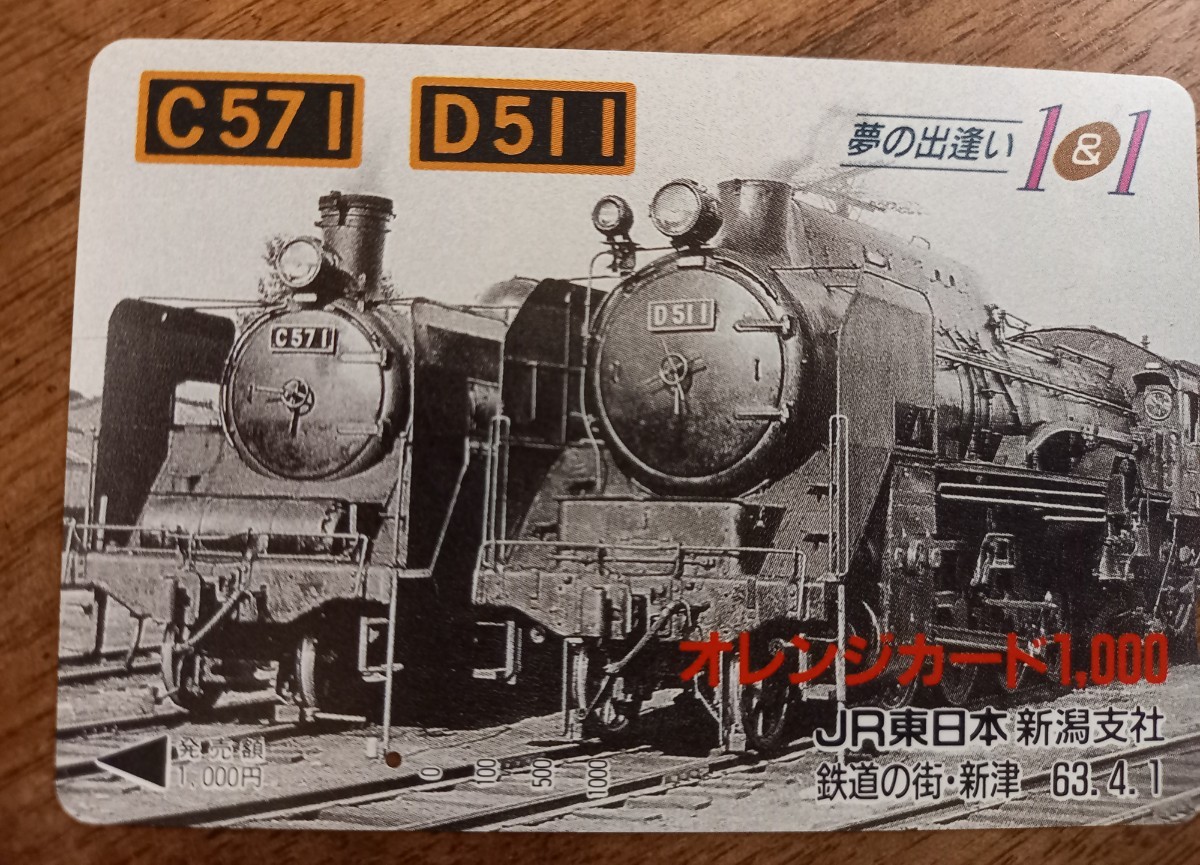未使用オレンジカード 夢の出逢い 1&1 C571/D511 鉄道の街 新津【一つ穴】です。