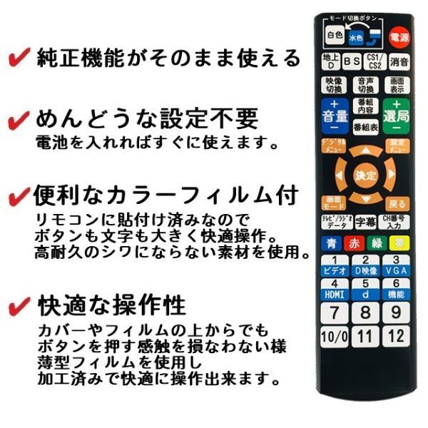 | 【商品名】 AKIA RC-T05DBA-AK 代替リモコン 【対応機種】 42FG05A-B 上記機種以外については、質問欄よりメーカーと型番をご連絡頂ければ、対応品のご案内をしております。 【商品について】 右側の代替リモコンが出品物になります。左側のリモコンは見本画像です。 タイトル機種のリモコン信号を入力した設定不要ですぐ使える純正品と同等の代替リモコンです。 リモコン左上のモード切換ボタンにて、各機能のボタンをお使いいただけます。 商品に不具合があった場合は代替品交換かご返金にて対応させて頂きます。 【付属品について】 防水リモコンカバーをお付けします。 ボタン機能を印刷した薄型フィルムはリモコンに貼付け済みです。 乾電池は付属しません。別途ご用意下さい。(単4乾電池×2本) 【発送について】送料無料 迅速発送を心掛けております。土日祝日はお時間を頂く場合ございます。 ポスト投函配達となり、日時指定は出来ません。 | ||