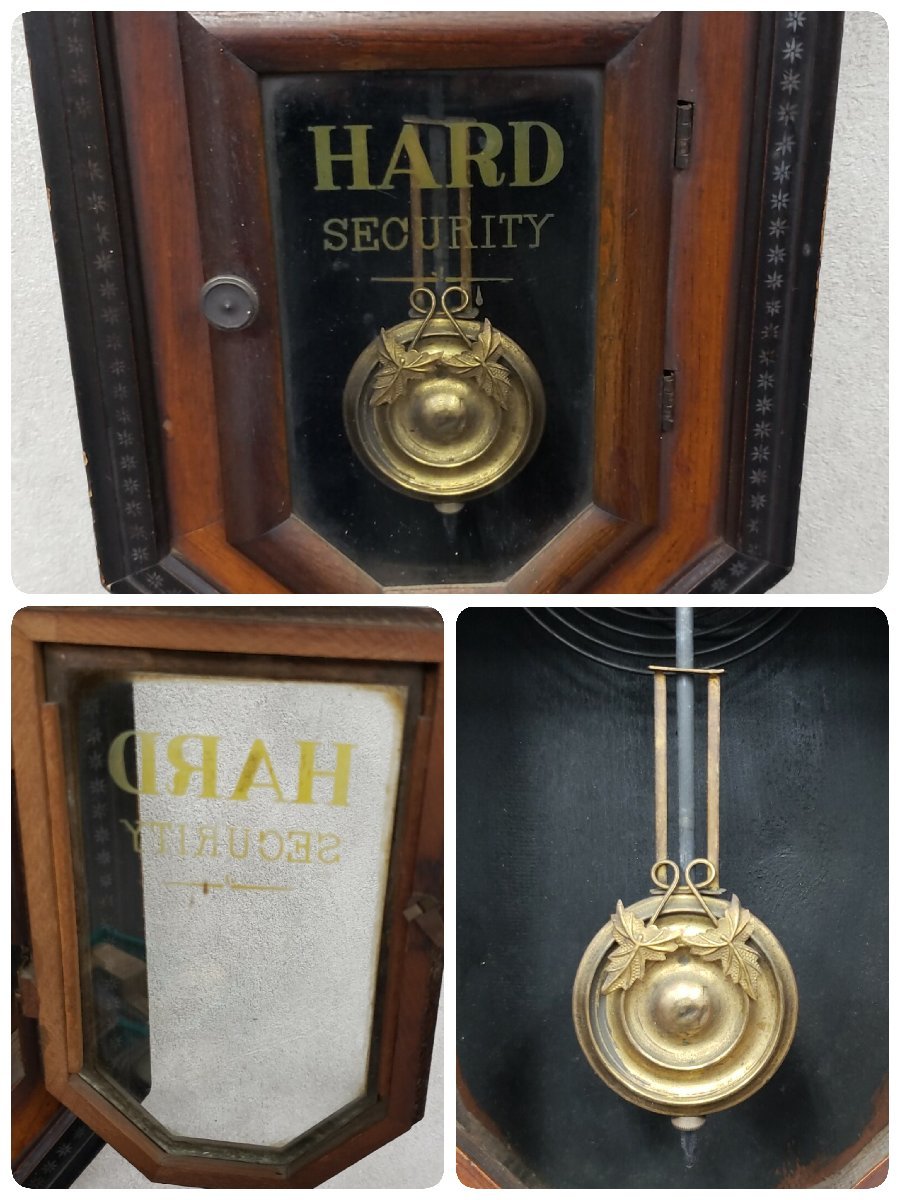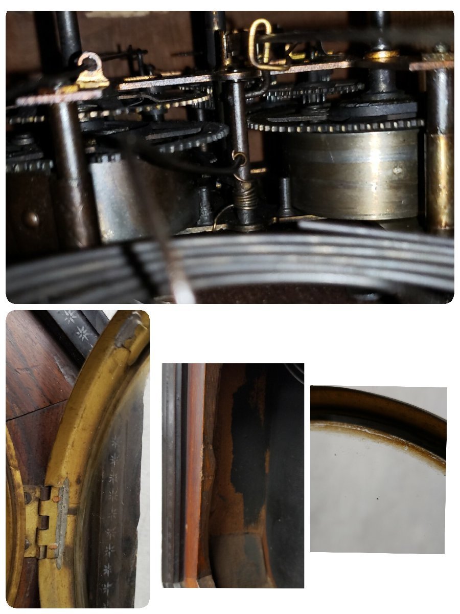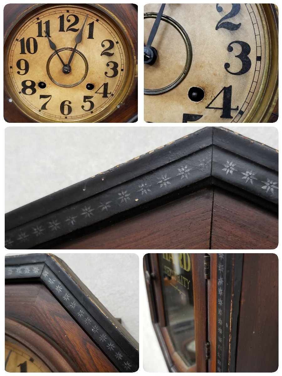 ゼンマイを回して振り子振ってみましたが、2分ほどで振り子が止まりました。振り子が揺れている間の時間は針が進みましたが、継続して振り子が稼働しませんでしたのでジャンク品です。 修理できる方、部品取りや飾り用をお探しの方いかがでしょうか。 古いものなので傷や汚れ、ガラスはくすみや黄ばみがあります。木製部分にはヒビ割れ等ございます。 時計盤のガラス扉をあけると新しいビスでとめてあり、補修された跡が見られます 人気の八角スタイルで、縁に花柄(雪)のような模様がありとても素敵です ※巻きネジはありません |
