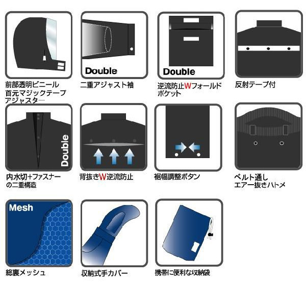 ◆製品機能・・・ 透明ビニールフード、前立て2重防水構造、逆流防止ポケット、高輝度反射テープ、W逆流防止背抜き、二重袖、収納式手カバー