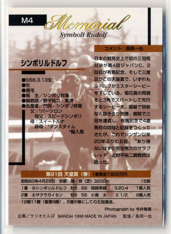 | ★シンボリルドルフ M4 メモリアルカード 銀文字箔押し バンダイ サラブレッドカード 99年上半期版 岡部幸雄 皇帝 史上初の七冠馬 顕彰馬 写真 画像 競馬カード 即決 | |