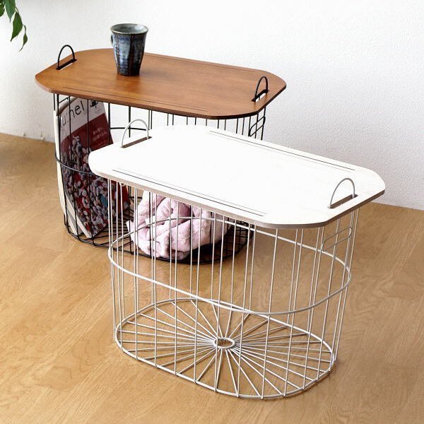 | こちらのページでは【Aカラー】のみの販売です アイアンのバスケットに 化粧合板の天板が付いた テーブルバスケットは 雑誌やひざ掛けなどの収納に便利なアイテム 中の物が見れるので 探しものもすぐに見つかりそうです シンプルなアイアンラインと ウッド調の組み合わせが お部屋に馴染みやすい優しい雰囲気で 飲み物やスマホが置ける 簡易テーブルになります 商品名 : オーバルバスケットテーブル 商品番号 : hbr5574 全体のサイズ(cm) : 幅48.3×奥行33×高さ38 バスケット内サイズ : 幅43×奥行30.5×深さ32.5 天板サイズ : 幅43.5×奥行33 材質 : アイアン 化粧合板 重量 : 2kg 天板耐荷重 : 約2kg 生産国 : 中国 ※商品の性質上、合板の小傷やアイアンのわずかな歪み、がたつきはご容赦ください |