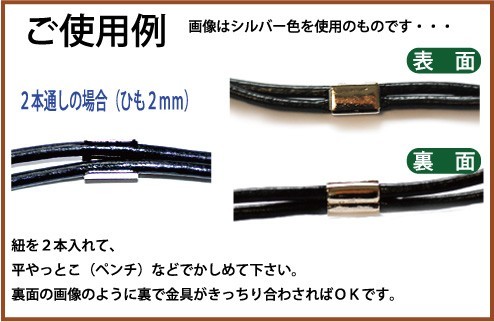 ●こちらは2コ入りの価格です。●使用する紐やゴム紐の目安1本通しの場合→太さ3mm~4mm程度の太さのもの2本通しの場合→太さ2mm~2.5mm程度の太さのもの輪っかにして、この金具でかしめて、ヘアーゴムやブレスなどにどうぞ~♪●金具のサイズ:全長 約7mm、幅約5mm●もっとお得な10コ入りや100コ入りのサービスパックもございます。(別ページにて)
