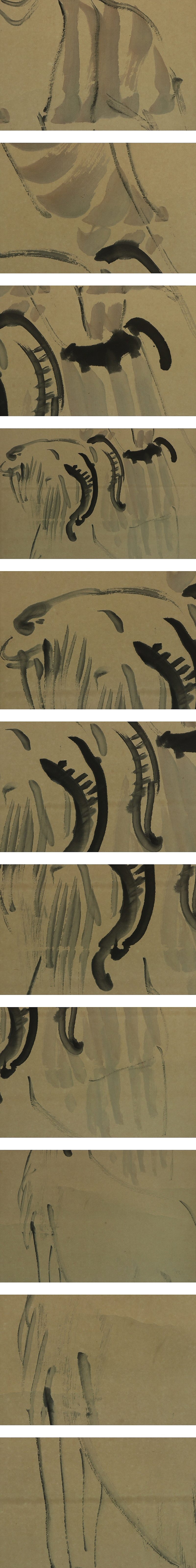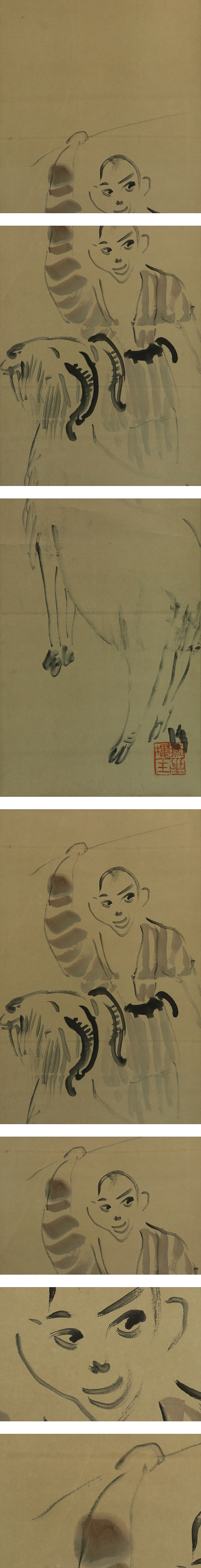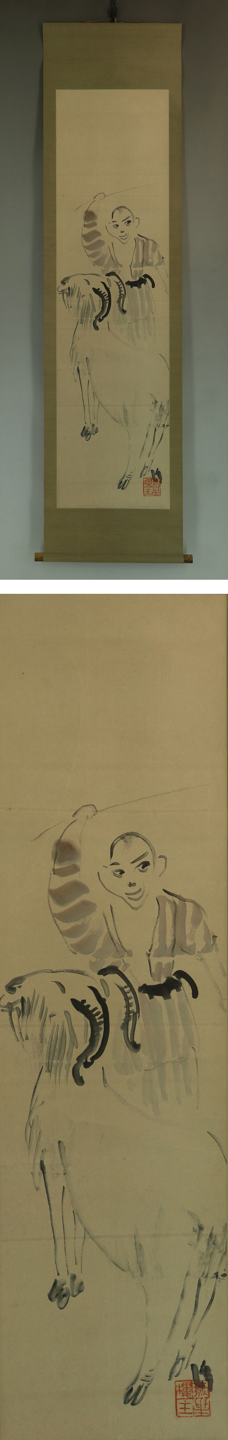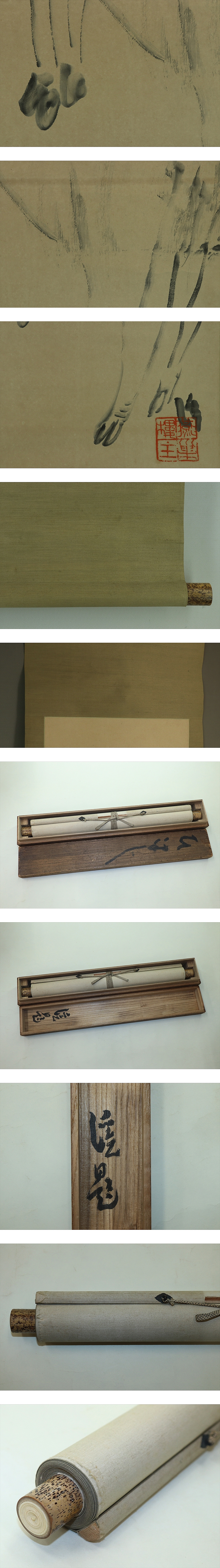 富田渓仙 とみた-けいせん(1879-1936) 日本画家。福岡県生まれ。 狩野派・四条派を学んだのち、南画の精髄を極め、自在な境地に達した。 本紙は、染み、汚れ、折れ、皺、ヤケがあります。 表装は、染み、汚れ、折れ、皺、虫食い、破れ、ほつれ、くすみがあります。 【サイズ】 作品 横約33.5cm×縦約126.5cm 表装 横約41.5cm×縦約162.5cm |