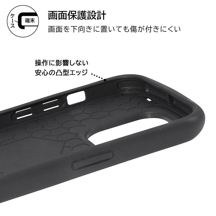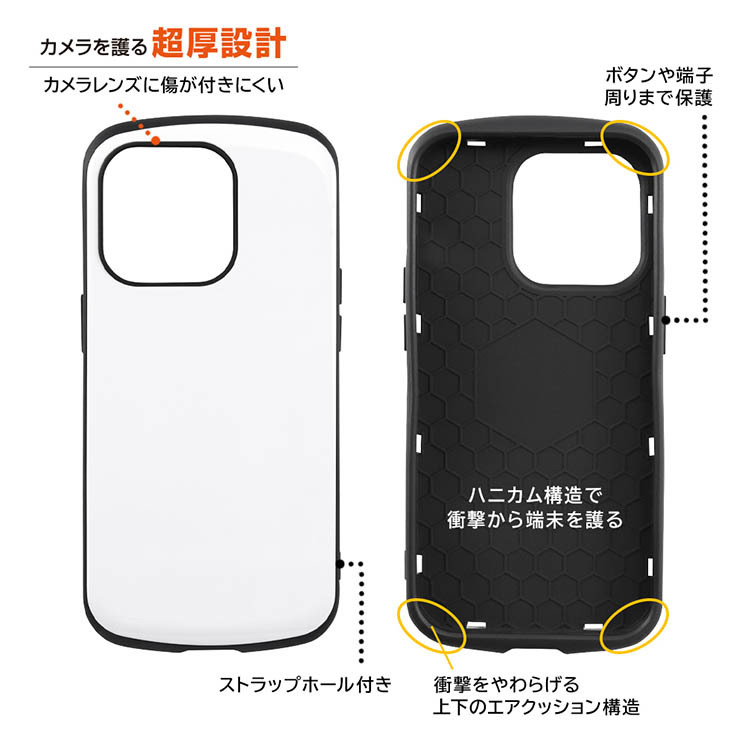 耐衝撃性の高いキャラクターケース。とにかく強い二重構造。衝撃をやわらげる上下のエアクッション構造。ケース内側のハニカム構造で衝撃から端末を護る。カメラレンズに傷が付きにくい設計。