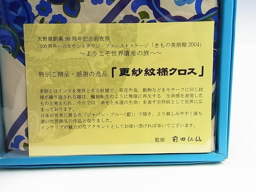 ■■■メーカー■■■ 浅井絞商事株式会社 天野屋 ■■■品 名■■■ 蒼染のれんクロス 更沙紋様クロス 2点セット ■■■状 態■■■ 【未使用】 こちらの商品は綺麗に畳まれたままの未使用品ですので、広げての検品は行っておりません。畳んだ状態ではシミなど見受けられませんが、万が一内側にシミ等あった場合でも現状渡しとなりますので、ご了承下さいませ。 ※お譲りする物は画像の物が全てです。 ※未使用品ではございますが、保管品であることをご理解の上、ご入札下さい。 ※外箱にスレ傷や汚れなどの傷みがございます。 ■■■商品説明■■■ ★「和」の新しい捉え方を提案する有松鳴海絞りのメーカー、浅井絞商事のクロスと天野屋創業98周年記念前夜祭の特別ご贈品、更紗紋様クロスのセットです★ |
