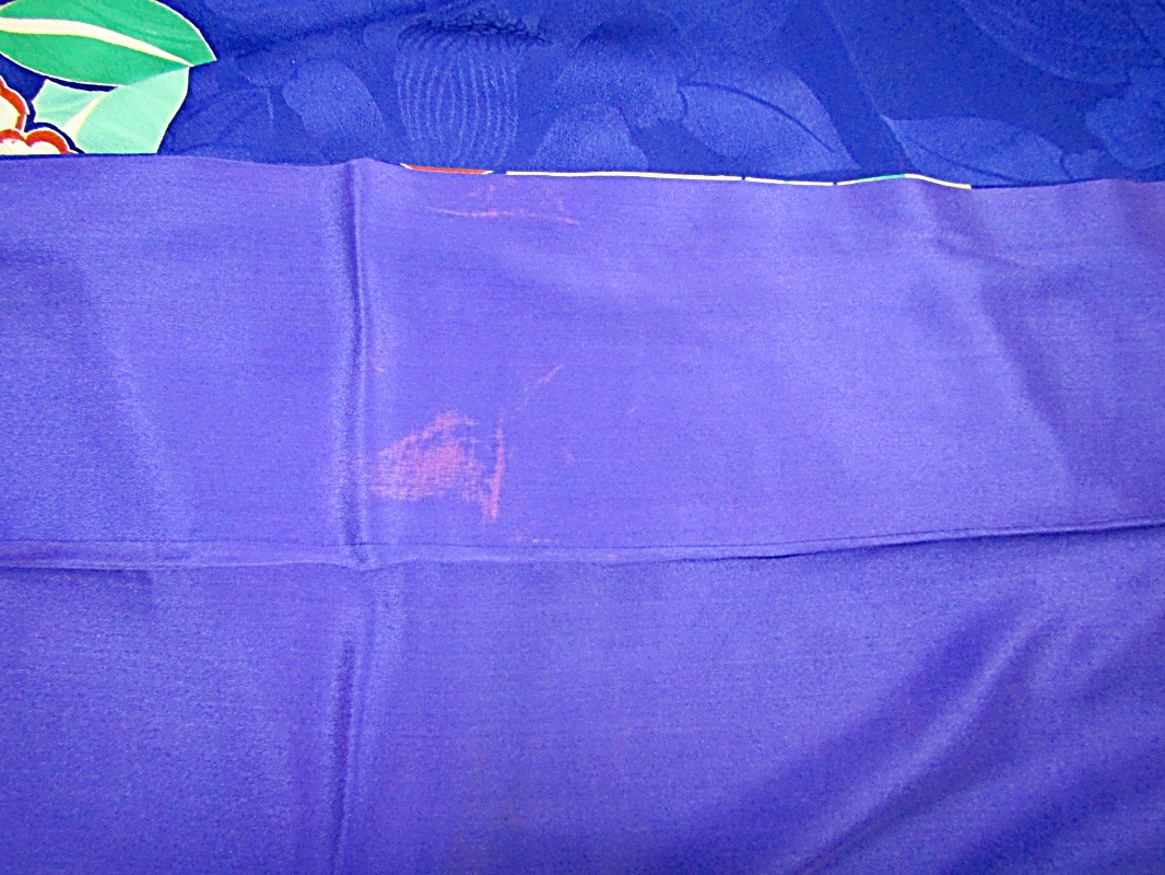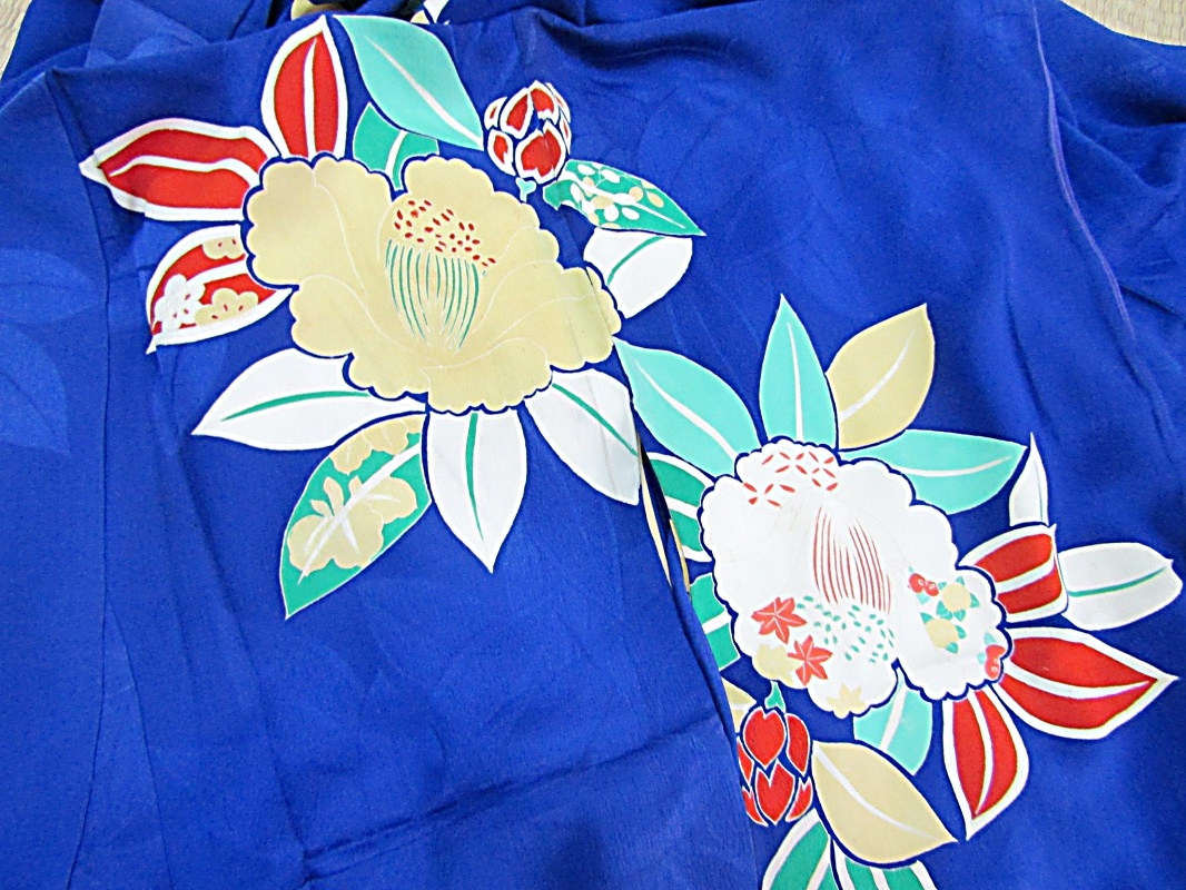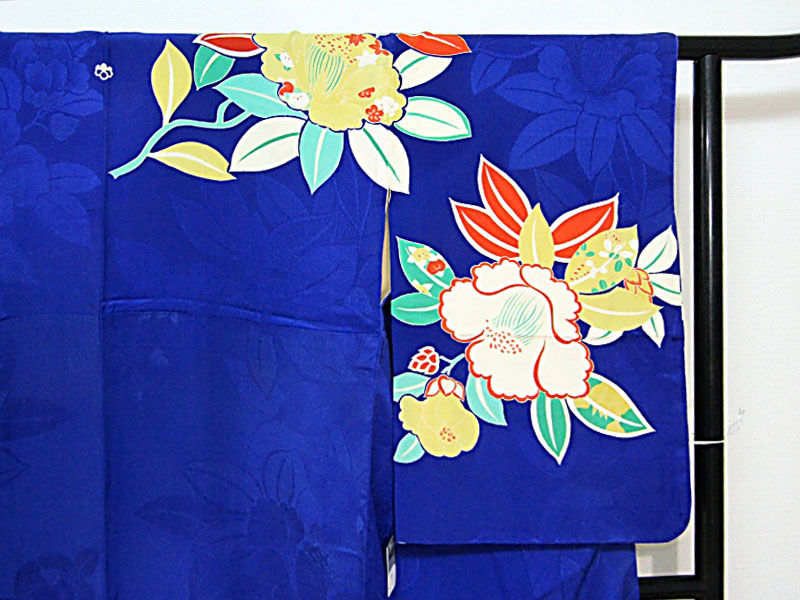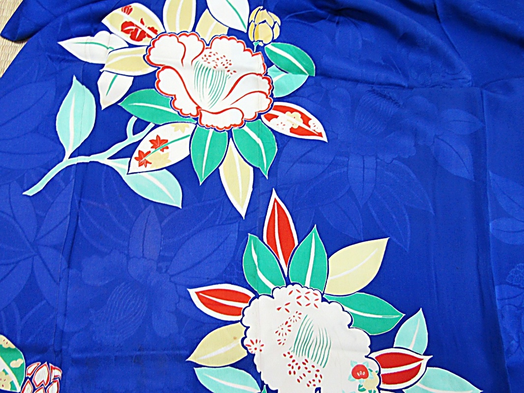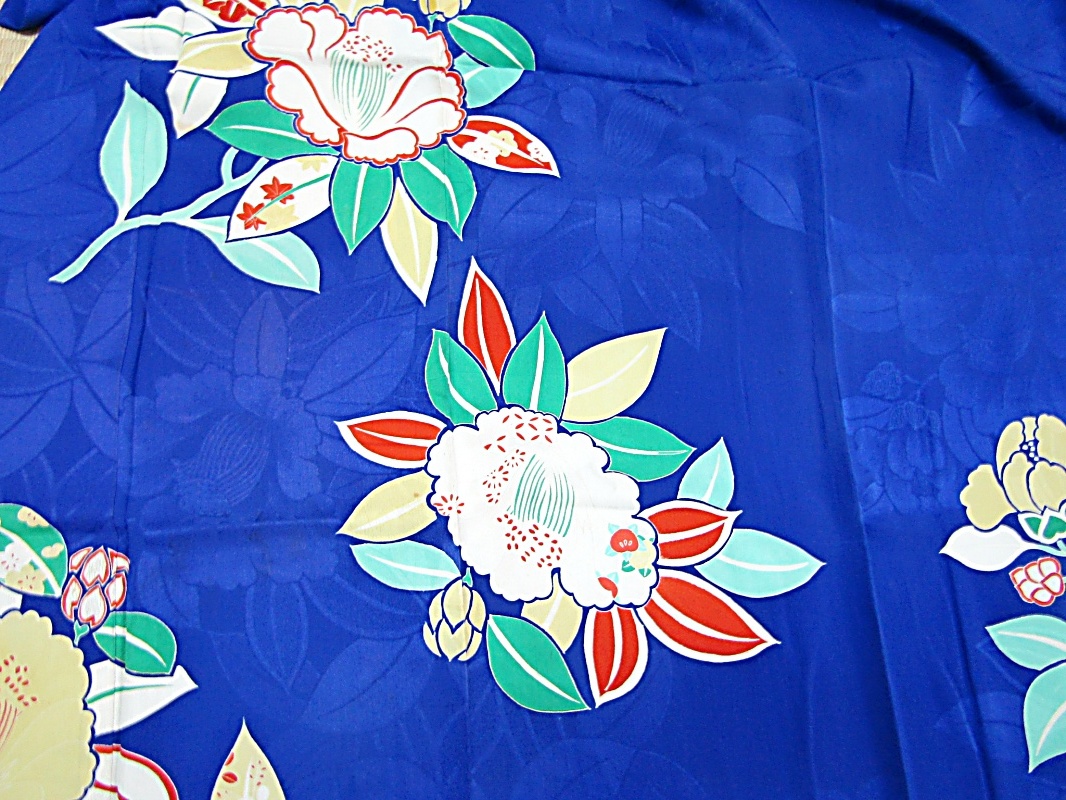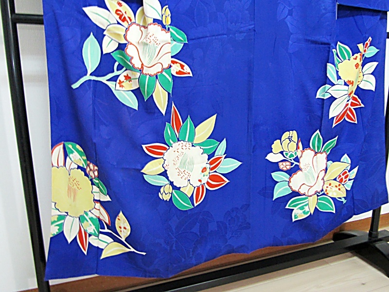 綺麗な花紺地、椿の花柄のアンティーク附下きものです。