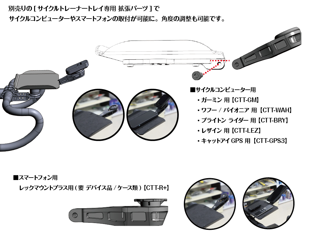 別売りサイクルトレーナートレイに本製品を追加することによって、トレイの先端にサイクルコンピューターの設置が可能に