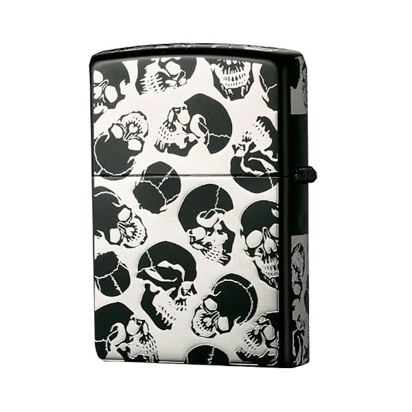 マットブラック塗装、5面大小のスカルをエッチングと色差しでデザインしたジッポー。