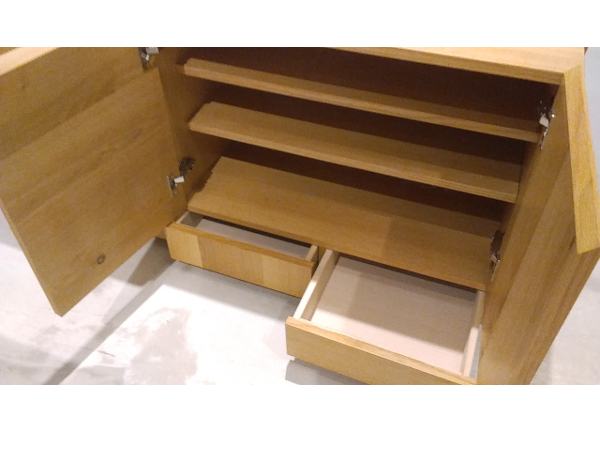 あえて節が入った突板を用い、表面に天然木の質感を強く出したサイドボード。上部の開き戸内は可動棚板による棚収納、下部は上から中身が見やすい引出し収納で、リビングやダイニングで機能的に収納できます。 お陰様で「評価2000」突入記念セール、未開封新品(写真は見本品)を送料無料!(北海道¥9,000、東北6県¥4,000、沖縄・離島等別途差額要)特別価格にてお届け致します!。