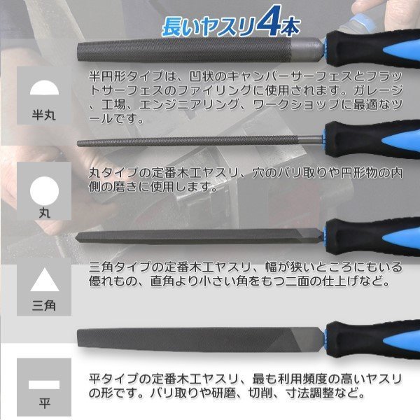 | 商品の詳細 | 商品詳細 200mm中歯平ヤスリ 200mm中歯半丸ヤスリ 200mm中歯丸ヤスリ 200mm中歯三角ヤスリ φ3×140mm×12アソート やすりブラシ 大型 全長250mm、作業部200mm 小型 全長140mm、作業部70mm | |