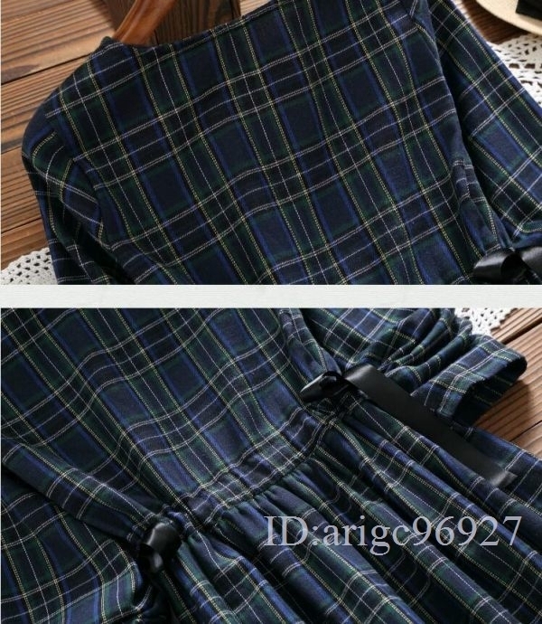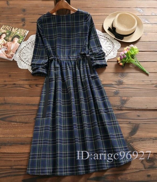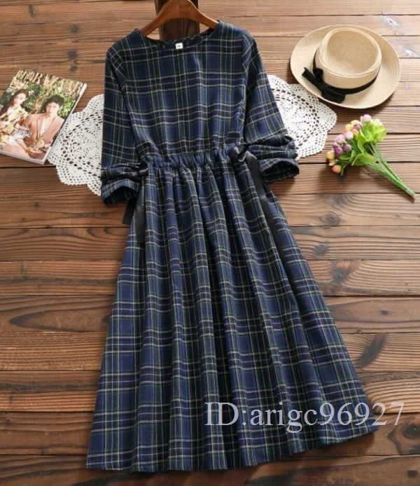 K32★オシャレ チェック柄 綿麻 リボン 着痩せ 長袖 ロング丈ワンピース サイズ選択可