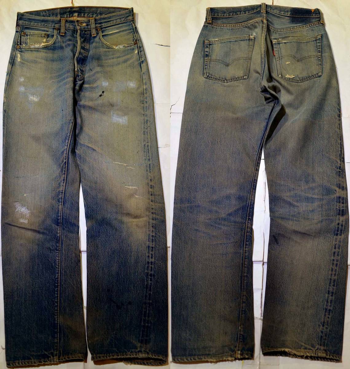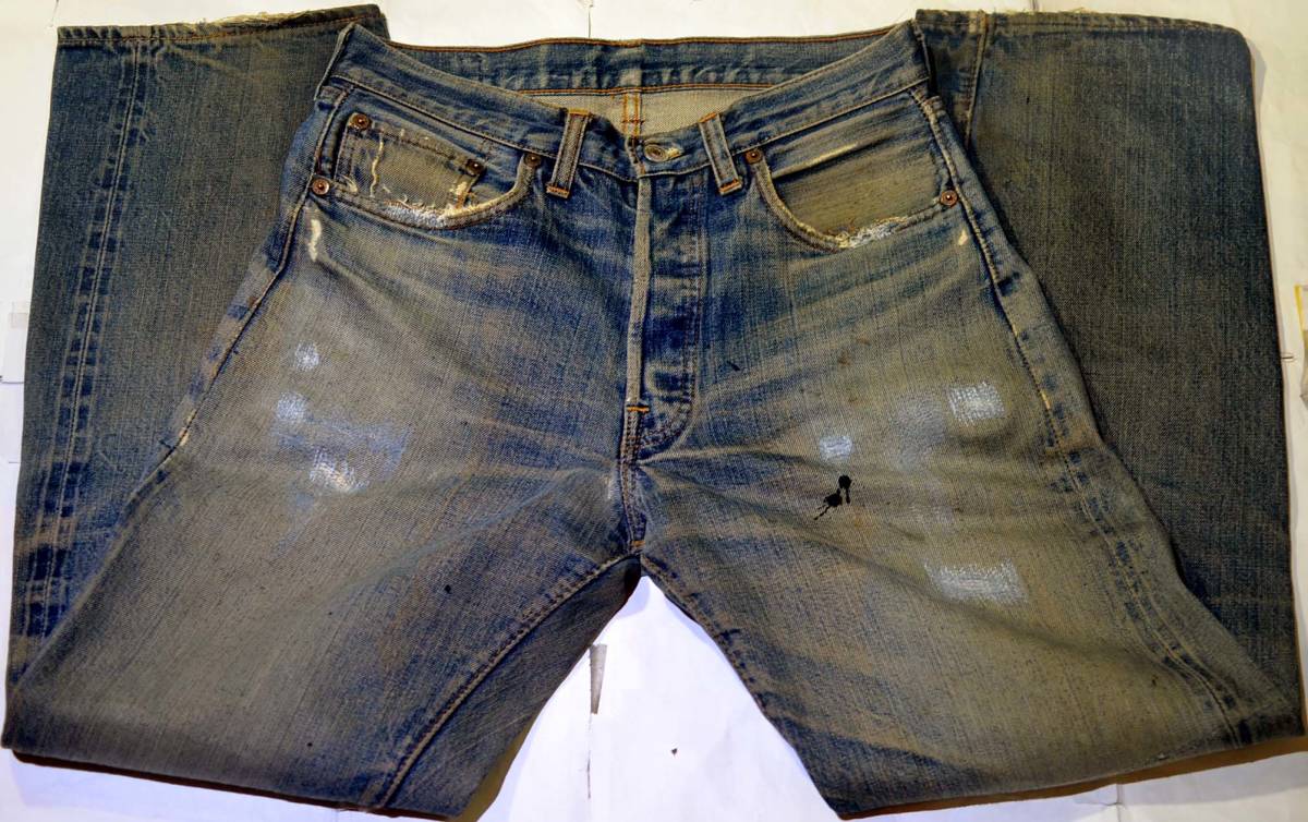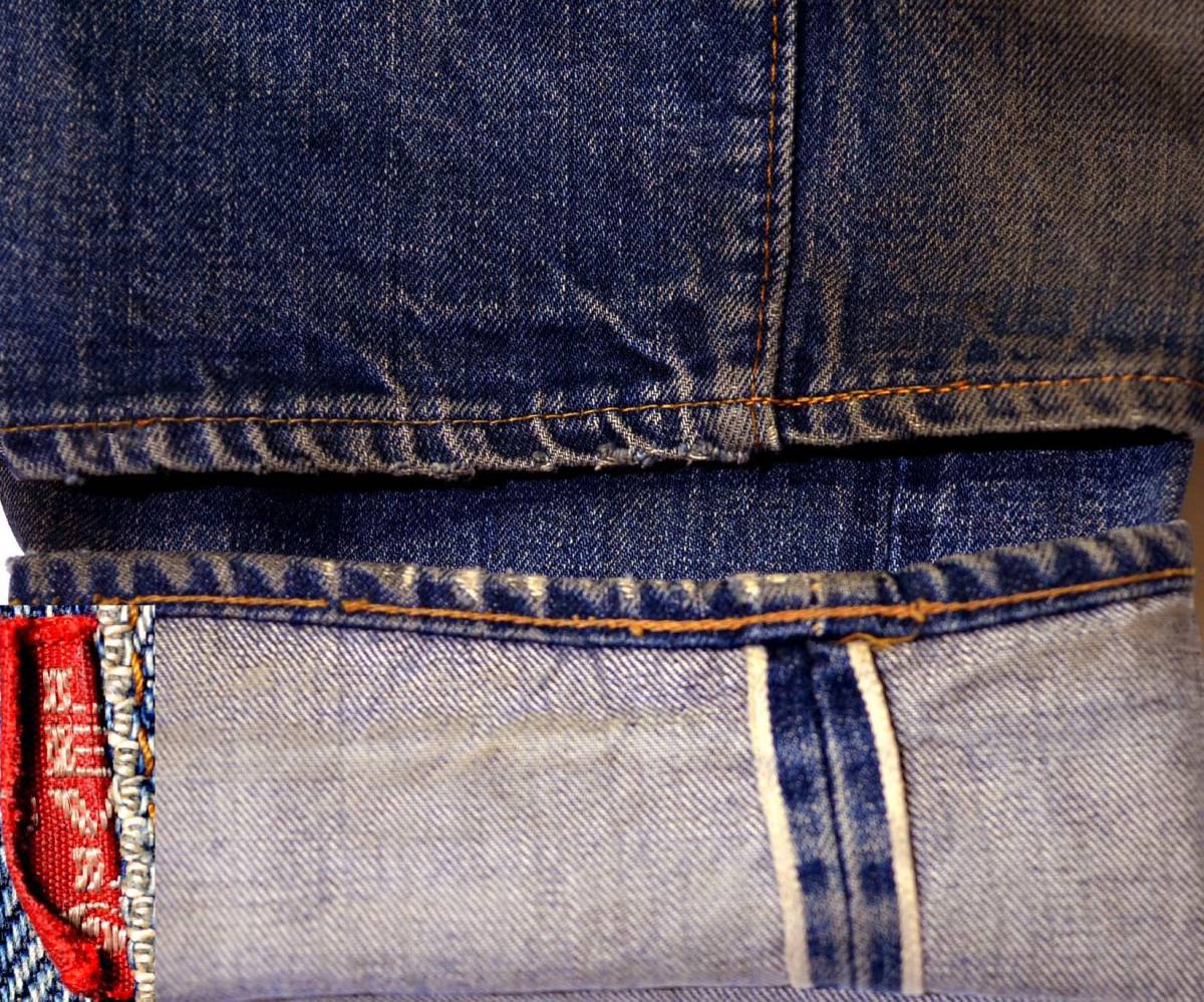 501ビッグEです。復刻、レプリカではありません。『ディテール紹介』フロントトップボタン裏の刻印6、裾オリジナルチェーンステッチ、66Eです。『状態』 リペア=両モモ、尻、前ポケ淵、ボタンフライ下。その他=スレ、キズ (右後ポケ、裾にダメージなど)、ステッチのほつれ・補強など USED感があります。 生地はしっかりしています。『色落ち、特徴など』グッドサイズの501ビッグEです。色落ちは抜群にかっこよく、ビッグE特有の非常に深みのある黒っぽいインディゴで、 全体に綺麗な縦落ちが見られます。 濃淡のメリハリもしっかり出ており、ハチの巣も見られます。本当に素晴らしい落ち方です。 サイド赤耳も綺麗に開きい、キャタピラ状のアタリがビッシリついています。ビッグEとしてベストな最高の風合いだと思います。 普通体型の方がジャストで着用するのに良いサイズです。