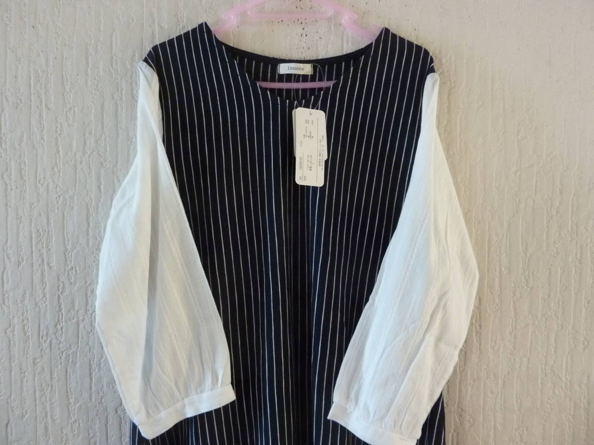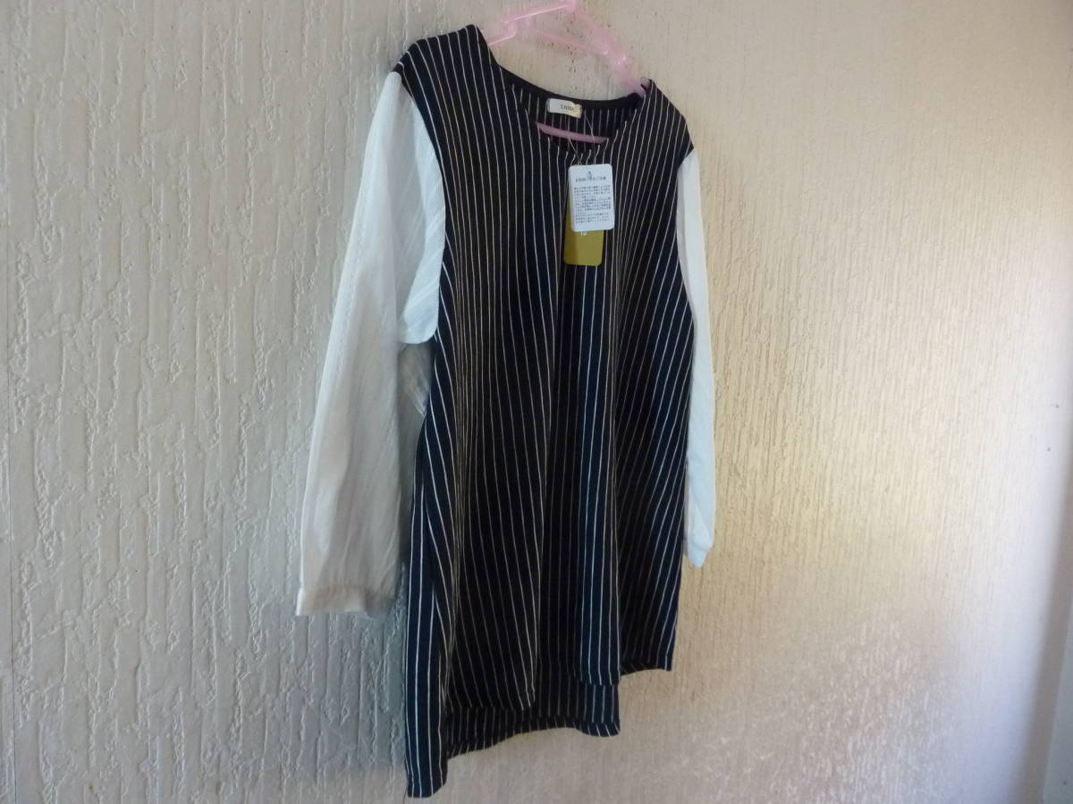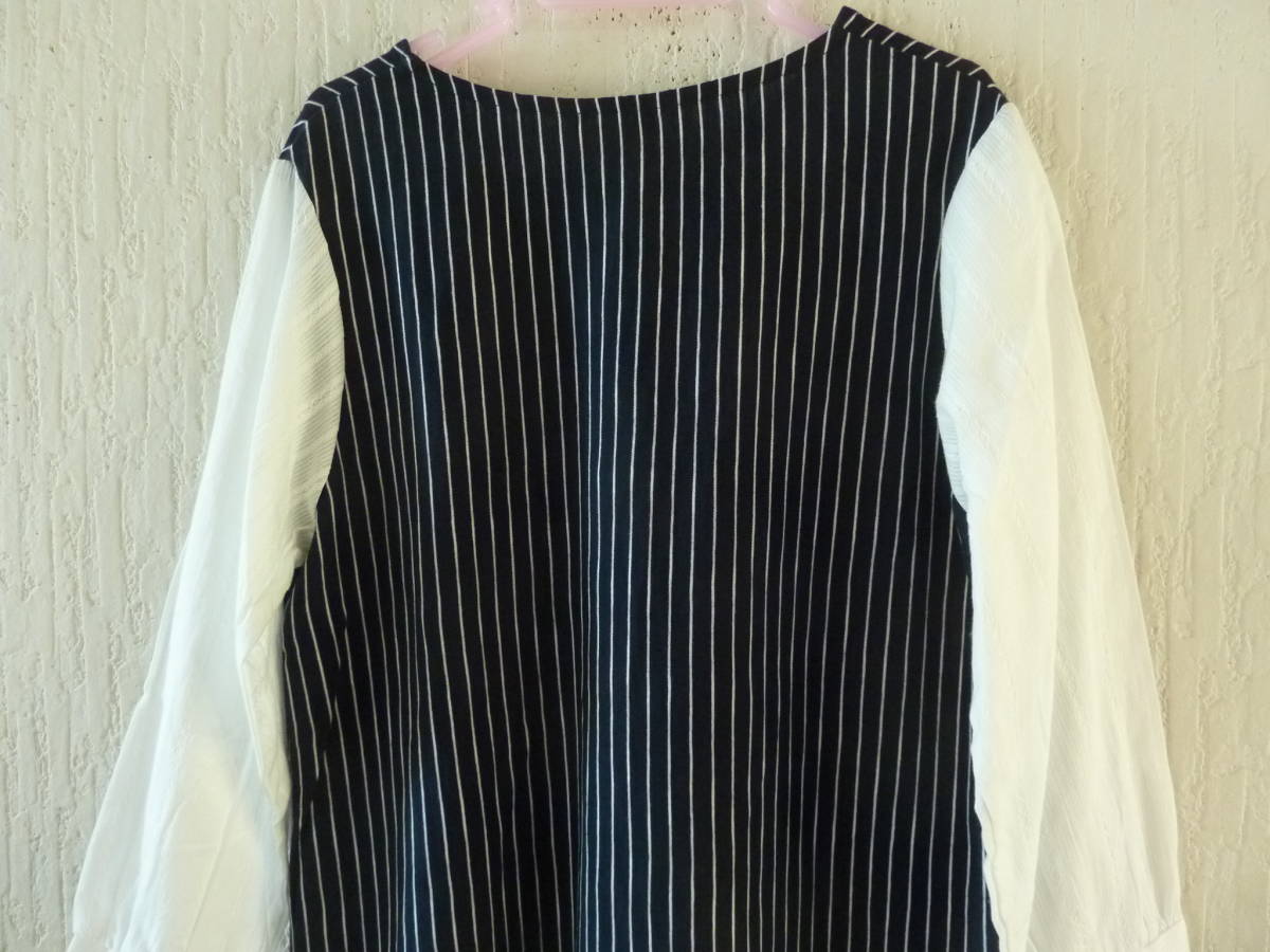★袖切替プルオーバー【レース風ホワイト】★薄地ニット(布帛)ストライプ柄☆ネイビー(濃い紺色)★レディースサイズL★新品未使用タグ付★