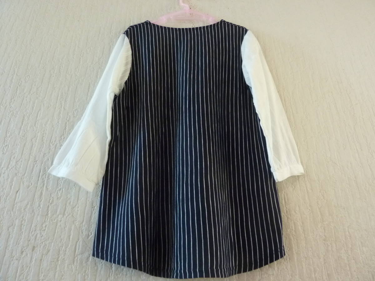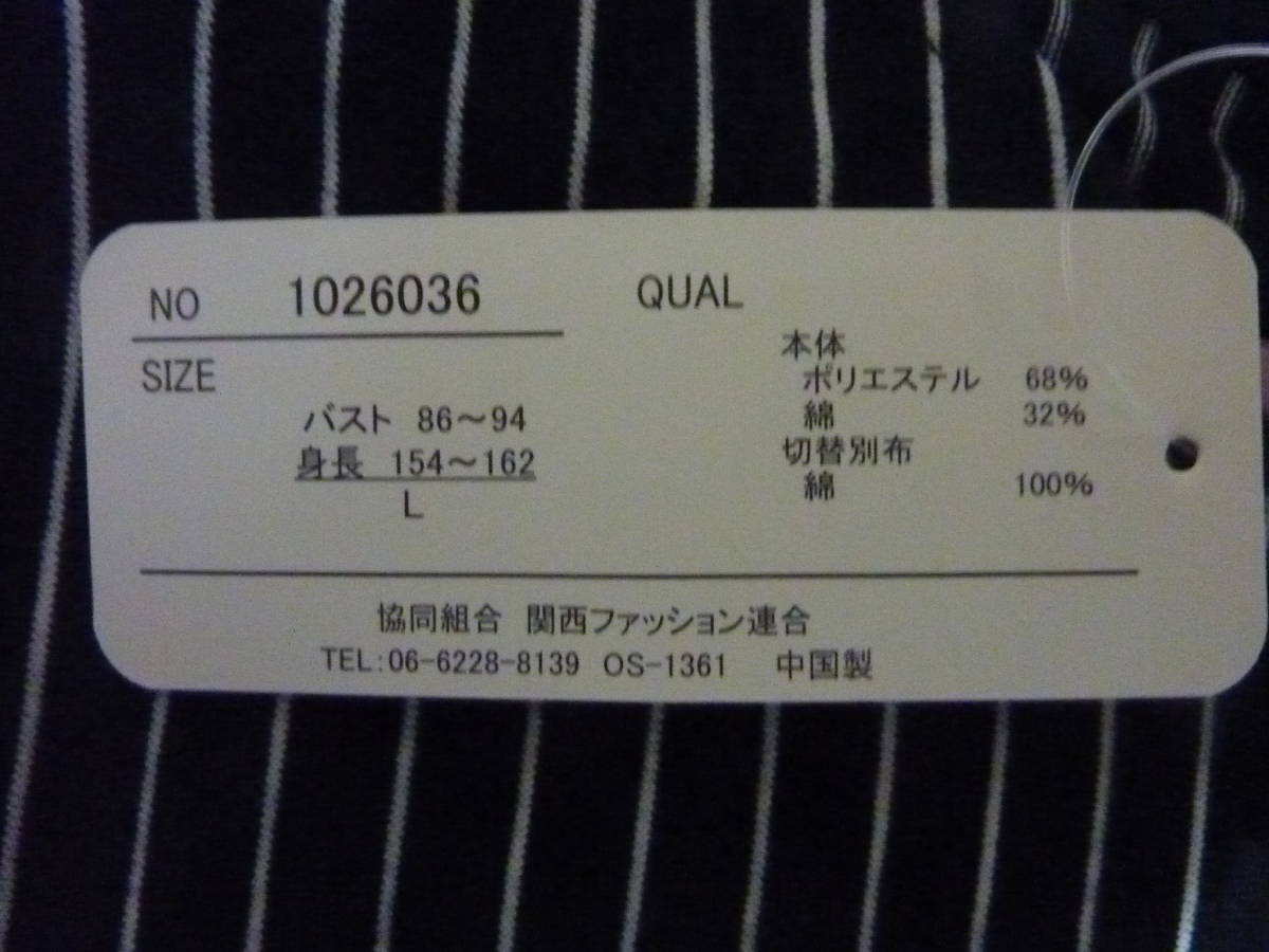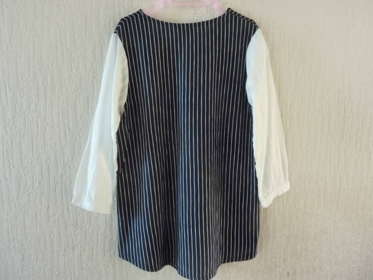 ★袖切替プルオーバー【レース風ホワイト】★薄地ニット(布帛)ストライプ柄☆ネイビー(濃い紺色)★レディースサイズL★新品未使用タグ付★