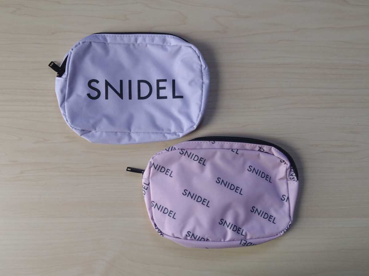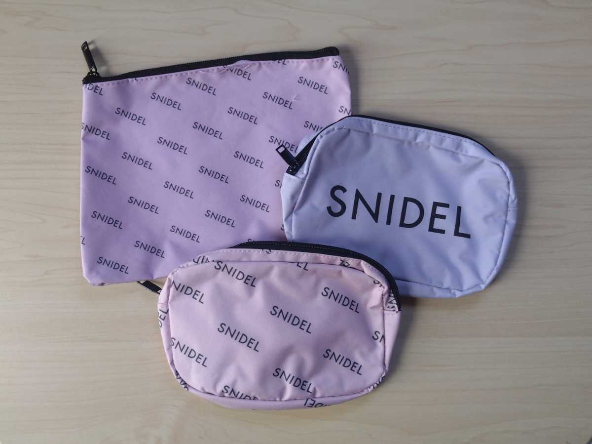 サイズは薄いパープルが約11×16×3cm、薄いピンクの方が約11×16×2cm、大きいものは約16×21cmでマチはありません。