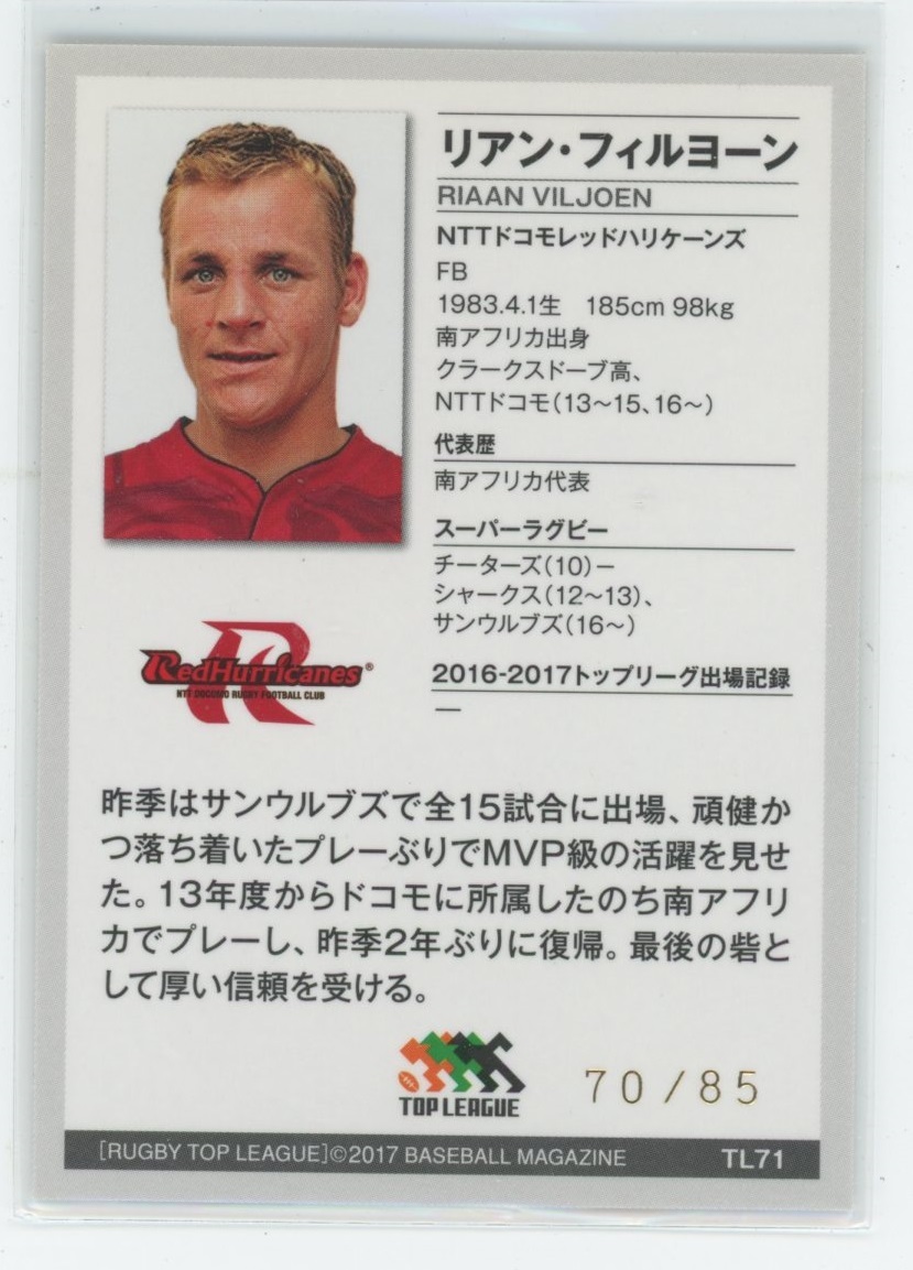 【リアン・フィルヨーン(NTTドコモレッドハリケーンズ)】2017-2018 BBMジャパン・ラグビー トップリーグ 直筆サインカード[70/85]