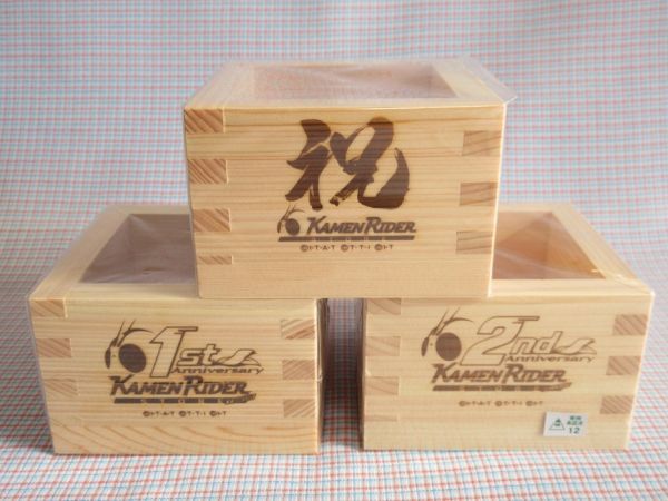 仮面ライダーストアの1周年記念と2周年記念で発売した枡と祝桧枡Vol.2の3個セットです。