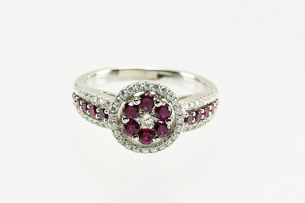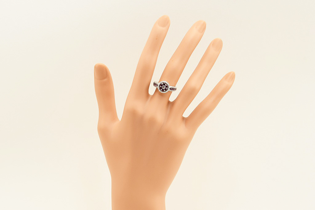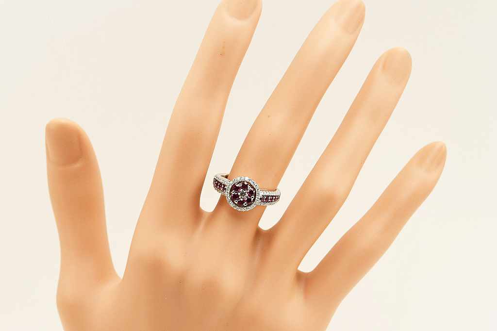 K18WGリング ルビー/ダイヤ付きデザインリング R0.63/D0.45 の品物です。センターに6石、両サイドに6石ずつ合計18石のルビーと、センターに1石、ルビーのまわりにメレダイヤが25石+18石+18石 合計61石が丁寧な爪留めで配置されています。ルビーは1石が小さいですが、色の良いものが留められています。ダイヤは色がついているものもありますが、インクルージョンが少なく、メレダイヤとしては質の良いものが使用されています。ルビーもダイヤも質の良いものが使用されていますので、キラキラと指元での存在感が半端なくございます。指輪のサイズは実測で12.5号となっております。