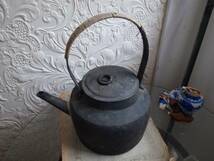 古道具鉄製ブラック薬缶です。手づくりでデザインがモダンで素敵です。大きめなのでタップリとお湯が沸かせます。鉄瓶のように使用していただきますと女性の鉄不足解消できます。使い勝手良いです。直火もできストーブにものせることができます。丁寧にできたお品物です。なんとも味わいがあります。当時物の縄巻き持ち手にございます、くすみ汚れほつれなどありますのでお取替えいただいても宜しいかと思います。持ち手多少のぐらつきございますが現状でお使いいただけます。中底溶接のぼこぼこ使用感ございます。注ぎ口の継ぎ目にハンダのお直しございます。現状で水漏れはありません。ご理解のある方宜しくお願い致します。佐川急便で発送させていただきます。*口径13cm高さ蓋つまみまで20センチもち手まで33,5センチ横幅27センチ底径22センチです。**NO2235