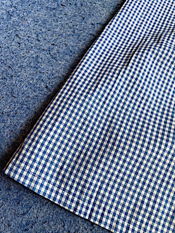 キーネック下にイニシャルタグ付き、着丈も十分あり、コットンとブルーギンガムチェックがマッチしてさらりと着用できる一着です。