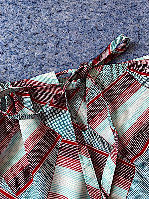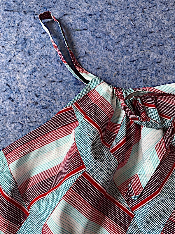肩ひも部分から 後ろ見頃、前身頃に共布の紐がを通し、キーネックの先でリボン結びで調節して着用します。