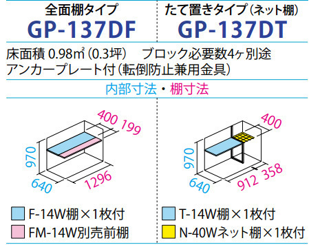タクボ物置 ジャンプ GP-137DF 全面棚タイプ(棚板1枚付)間口1304mm奥行750mm高さ1100mm 扉カラー選択可能 送料無料