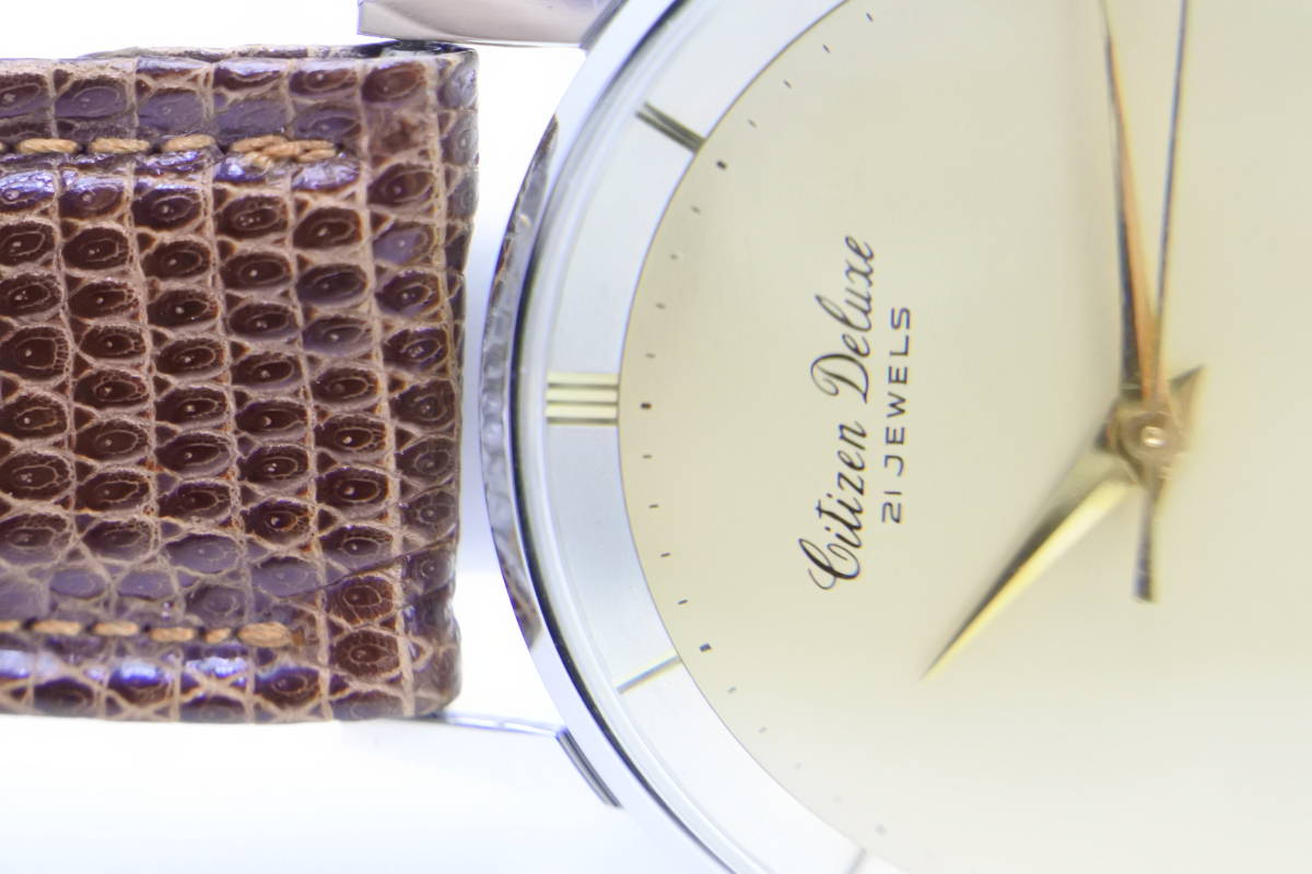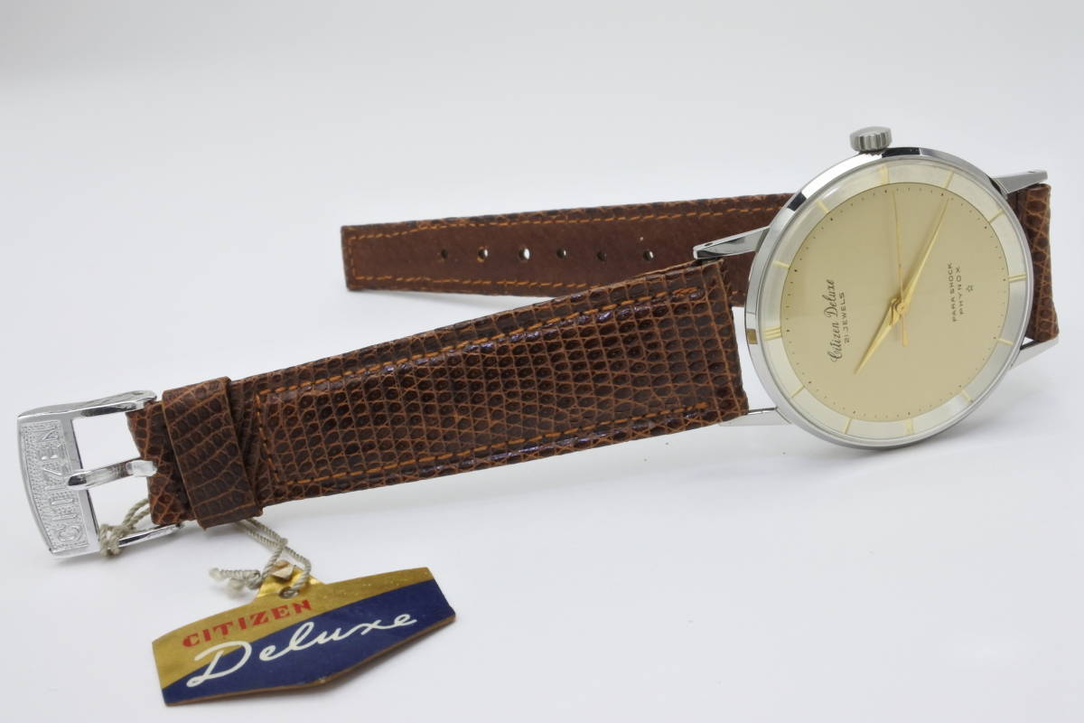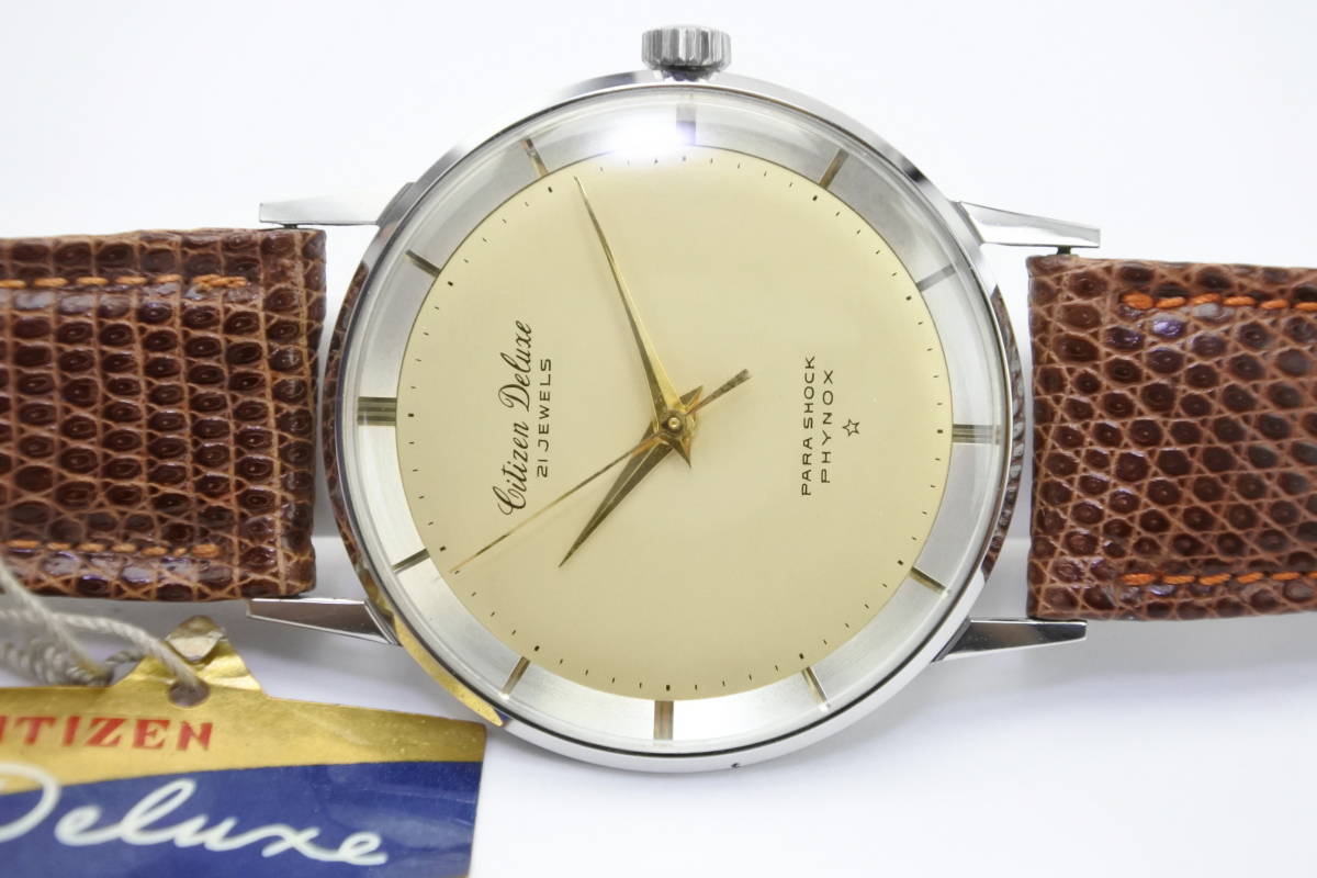 シチズンの「デラックス」です。シチズンのデラックスはセイコーのクラウンに対抗してシチズンが1958年に発売したモデルで、当時では高精度、様々なバリエーションのデザイン、国産時計で一番の薄さを誇り、圧倒的人気を誇ったシリーズです。軸受の油の保油性を良くする構造「プロフィックス」、耐震装置「パラショック」、切れないゼンマイ「フィノックス」等を全て採用したため耐久性に優れ、スイスの時計検定所より「特に優秀」と認められる程の品質の良さを誇りました。