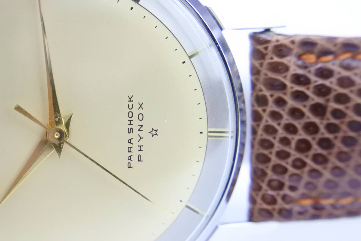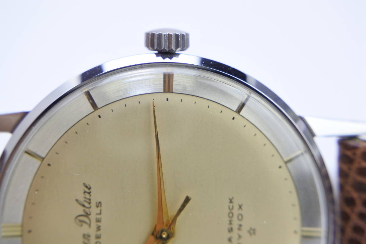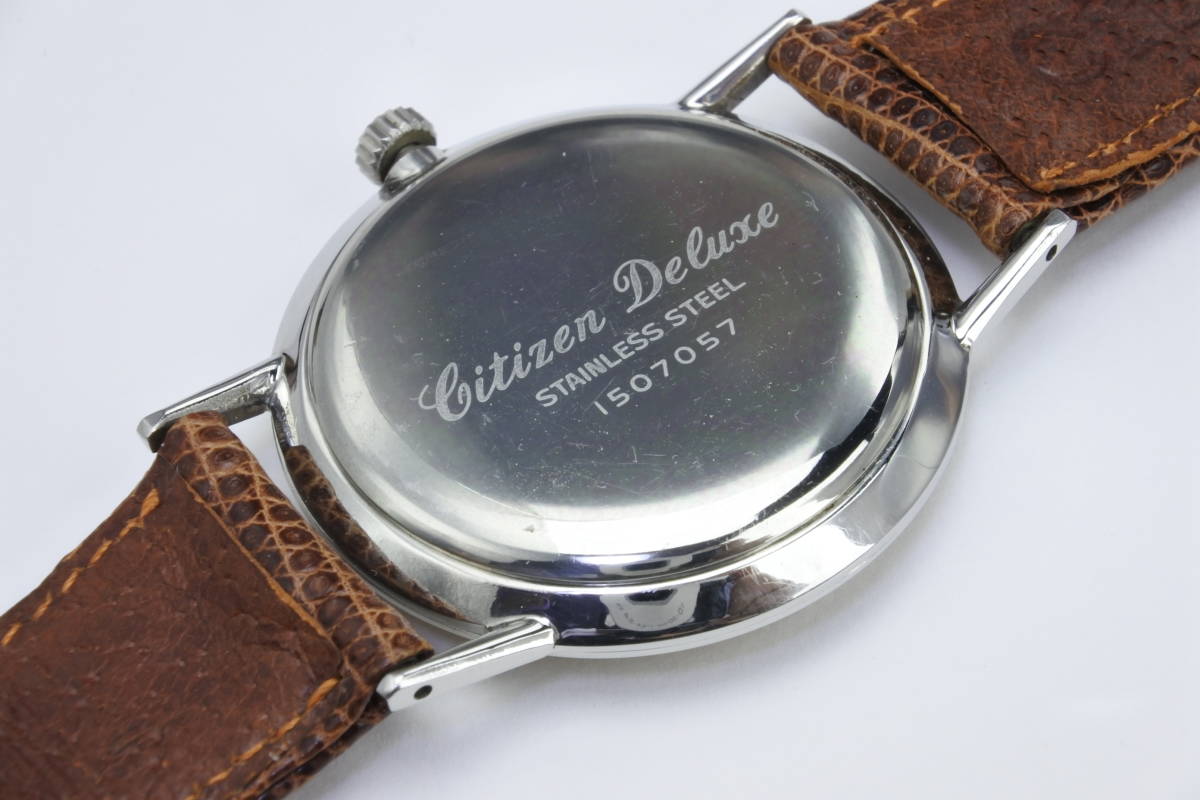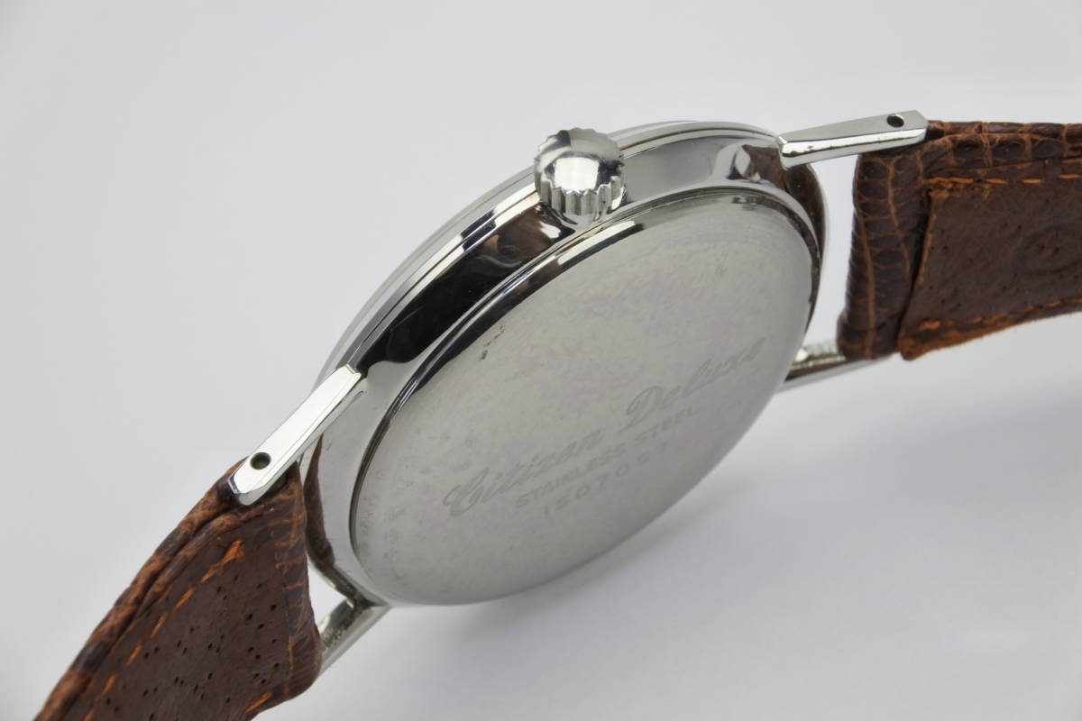 シチズンの「デラックス」です。シチズンのデラックスはセイコーのクラウンに対抗してシチズンが1958年に発売したモデルで、当時では高精度、様々なバリエーションのデザイン、国産時計で一番の薄さを誇り、圧倒的人気を誇ったシリーズです。軸受の油の保油性を良くする構造「プロフィックス」、耐震装置「パラショック」、切れないゼンマイ「フィノックス」等を全て採用したため耐久性に優れ、スイスの時計検定所より「特に優秀」と認められる程の品質の良さを誇りました。