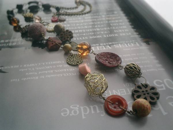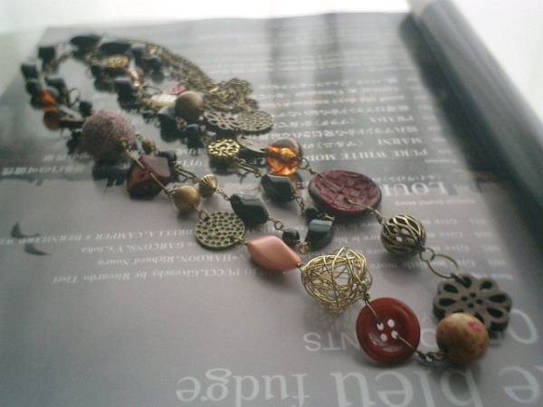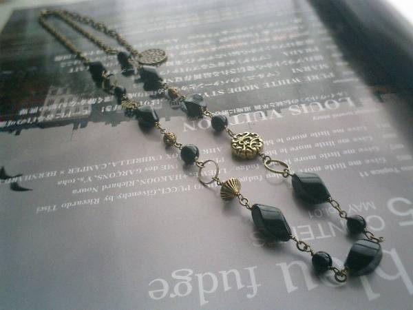 大人の黒に魅せられて・・シリーズです♪シックな黒の石を集めたシリーズです♪キュートな異素材を集めたネックレス2本セットです♪♪シックな黒のネックレスは6ミリ、8ミリの丸玉、12×8ミリ、17×8ミリのツイストオーバルのオニキスにデザイン違いのメタルビーズを合わせてさりげなく華やかです♪長さは全長75センチ位で調節自由です♪チョーカー風にされてもブレスにされても素敵です♪異素材のネックレスは同じ8ミリの丸玉、12×8ミリ、17×8ミリのツイストオーバルのオニキスに10ミリから28ミリ位までのウッドや編みボールやアンティークボタンやシェルボタン、チェコビーズ、デザインメタル、ワイヤーボールなど個性的な素材を合わせました♪シックなお色でまとめて大人ニュアンスのあるネックレスです♪長さは全長107センチ位で調節自由です♪2連にされても可愛いです♪それぞれ単品でも出品しています♪お揃いのブレスレットも出品しています♪シンプルで飽きのこないいつまでも着けられるデザインを考えて作りました!ハンドメイドをご理解頂いてノークレーム、ノーリターンでお願いします