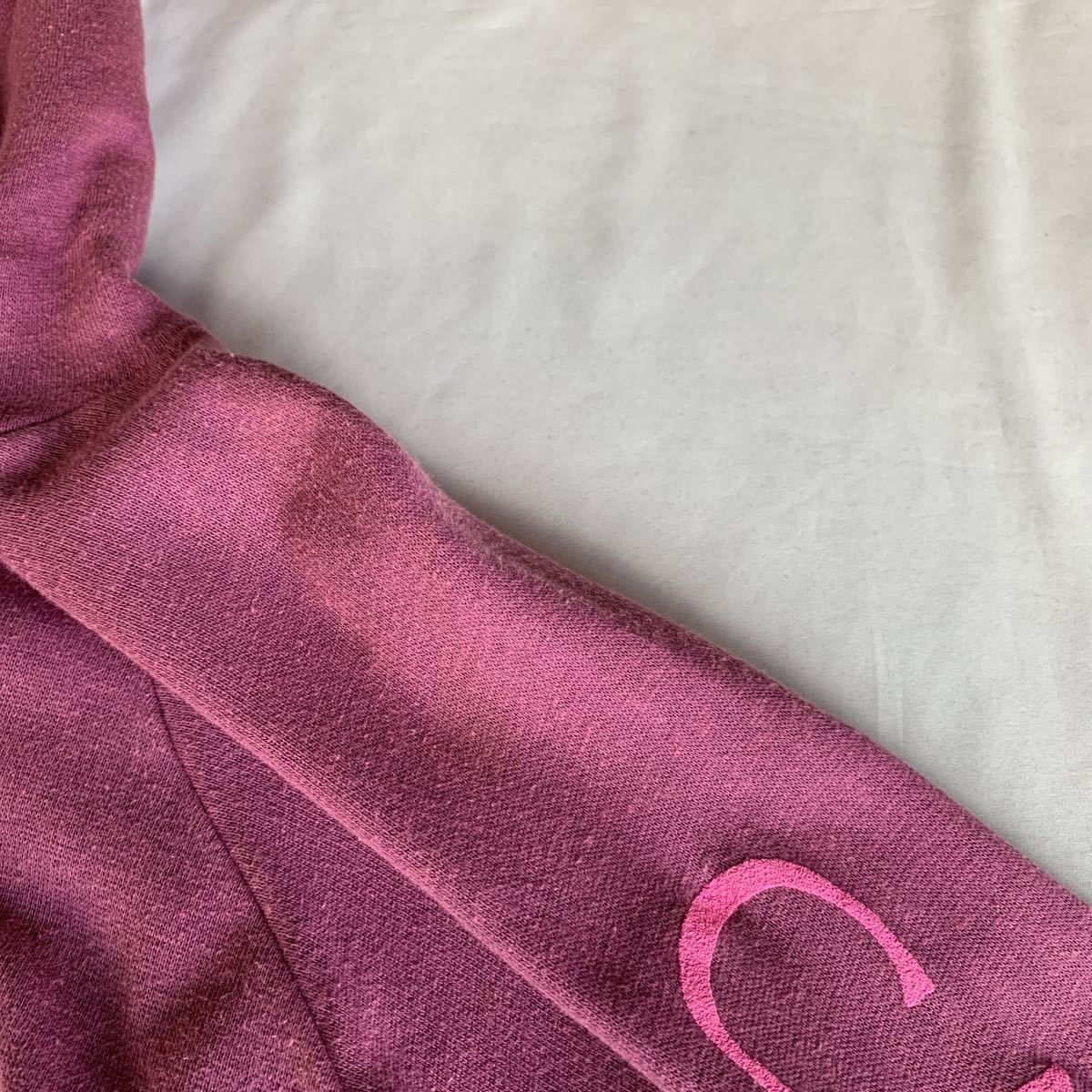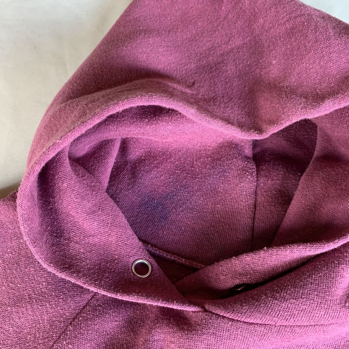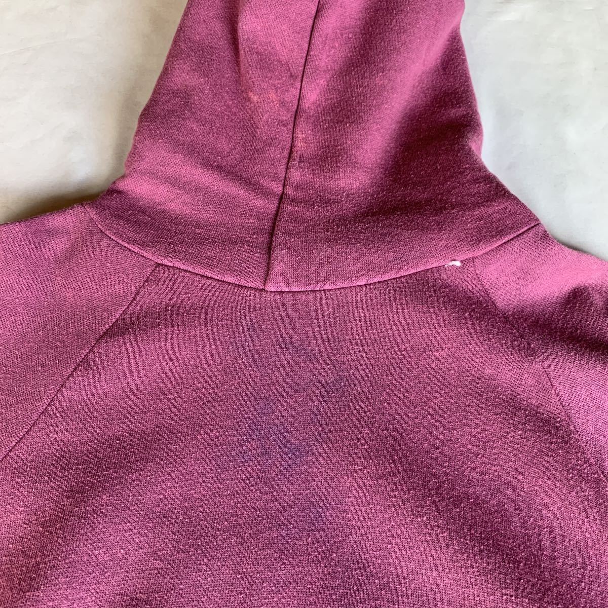 左肩と背面の背中部分に薄い汚れがあります。背面の背中と右袖先、フード内部に多少の色移りがあります。全体的に見てグッドコンディションです。