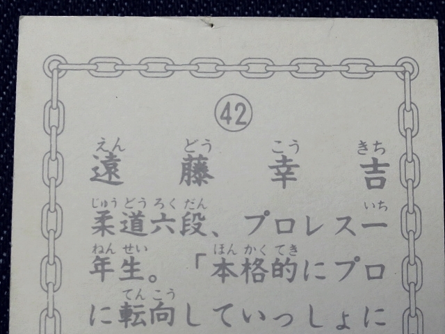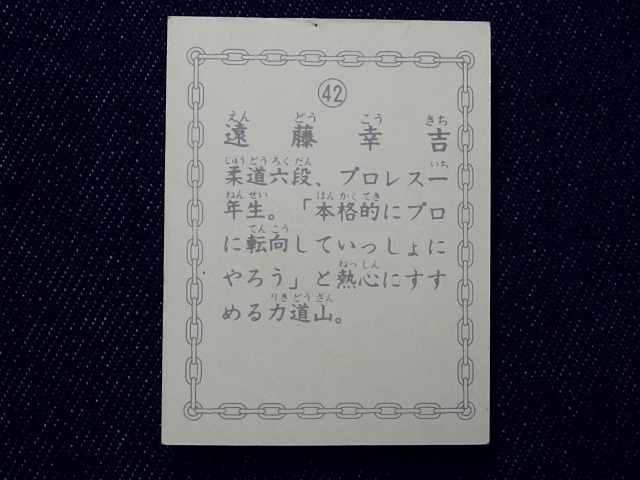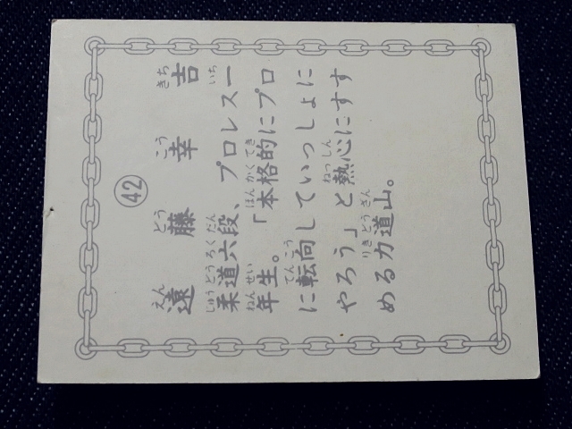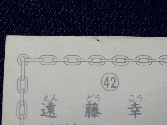 空手バカ一代 ミニカード バラ売り 1枚 ・メーカー:天田 ・6.5cm x 5.0cm ・1974年代、当時の放送時に販売 ・中古扱い 画像判断にてお願いします。 ・1-60番の60種シリーズ ・同梱発送可能(複数落札の場合:定形、定形外郵便は、送料が変わる場合があります。) 〓参考項目〓 ・原作:梶原一騎、つのだじろう ・監督:岡部英二、出崎統 ・脚本:硲健、吉田喜昭、七条門、吉原幸栄、井村淳、松本昭典、小森静男 ・音楽:小谷充 ・アニメーション制作:Aプロダクション ・製作:NET、東京ムービー ・放送局:NET系列 ・放送期間:1973年10月3日 - 1974年9月25日 ・話数:全47話 ※声の出演※ ・飛鳥拳:田中信夫 ・有明省吾:神谷明 ・ナレーション:大木民夫 ・辰:納谷悟朗 ・上官:塩見竜介 ・米兵:青野武 ・将校:細谷重之 ・夜の女:牧野和子 ・柿屋:峰恵研 ・子分:立壁和也 | ||