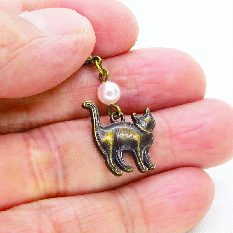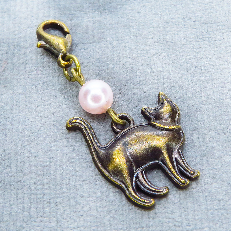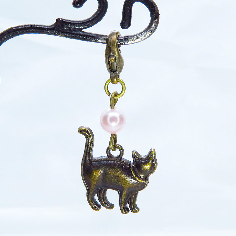 マスク・スマホチャーム アンティークゴールド 歩き猫モチーフとスワロフスキーパール(ロザリン)のチャーム ジャックピン追加可