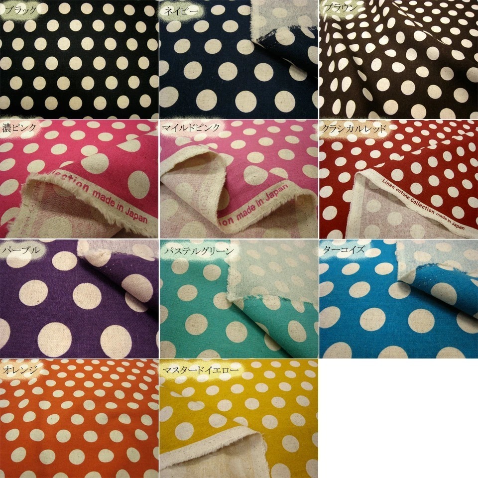スタイリッシュで素敵なカラーの水玉柄が綿麻キャンバスの生地で登場。しっかりめの生地で、大きめの水玉柄。ドット柄好きな方ははずせない生地です。小物作りやインテリアのカバーなど、どんな作品にも使えそうです。どのカラーもお薦めで、素敵な作品を作ってみてください。