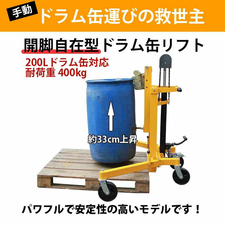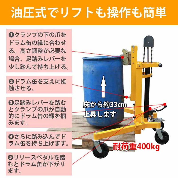 ドラムリフト ドラム缶運搬車 ドラム缶用移動リフト ドラム缶運搬台車 油圧式 ドラム缶リフト DT400C 耐荷400kg ドラム缶 運搬車 台車 ドラム台車 キャリー ドラムキャリー 運送 運送車 運搬機 運搬具 ドラムリフター ドラム缶ハンドリフト ハンドパレットトラック 手押し 工業用 作業 作業用 工場 工業用品 業務用