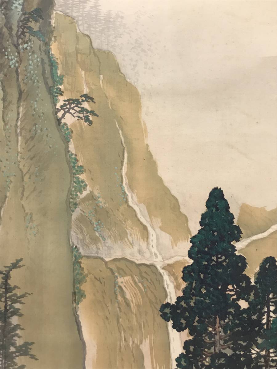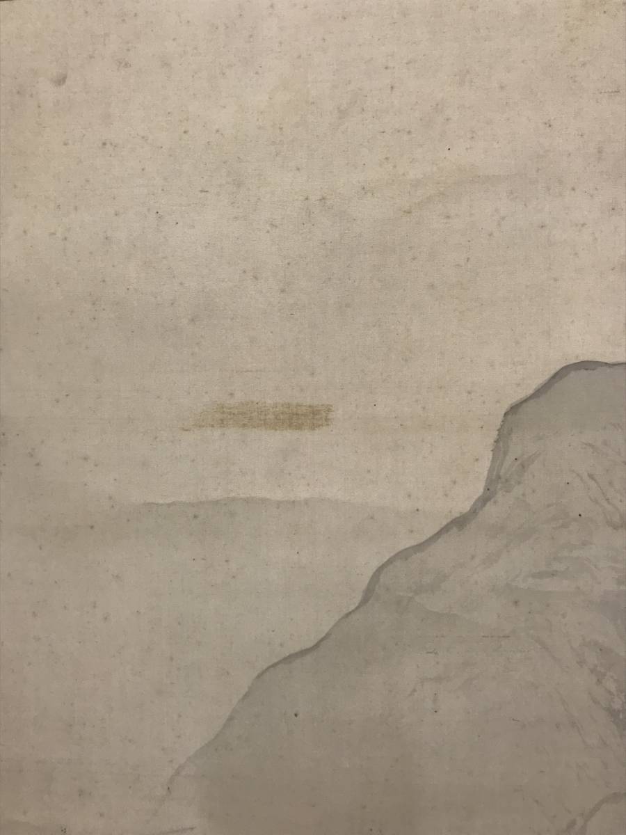 【作品状態】 本紙は絹本肉筆です。本紙は薄汚れ、全体に汚れシミと多数の糊シミあります。表装は薄汚れ、天地に多数の汚れシミ、糊シミ、多数の折れ、巻シワなどあります。