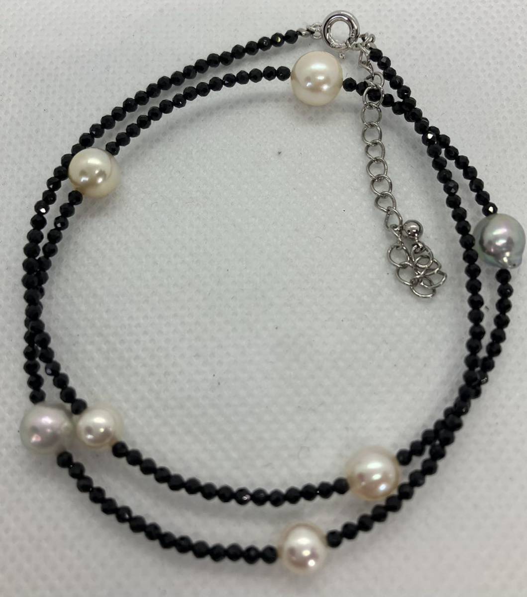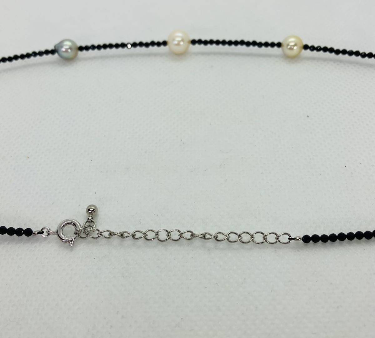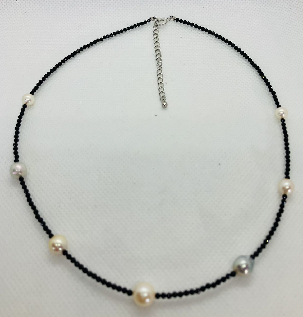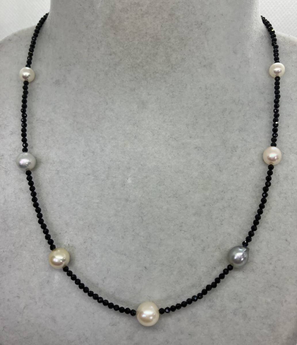 アコヤパールの天然に白、イエロー、ブルーを使って、2ミリにミラーカットさせたブラックスピネルに、3センチ等間隔に配置されたステーションネックレスです。アコヤのサイズは、5.8ミリから7.9ミリまでのグラデーションです。全長は、40センチに5センチのフリーアジャスター付きとなります。